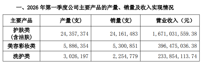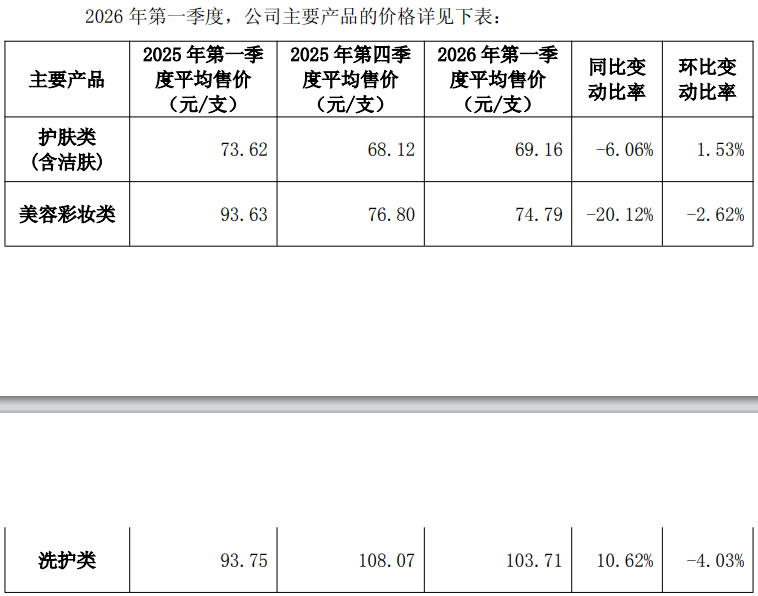 护肤类(含洁肤)产品2026年第一季度平均售价同比下降原因:主要系单价较高的大单品(精华、面霜类)销售占比变动所致。