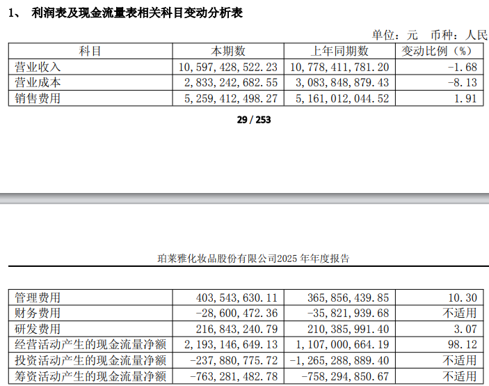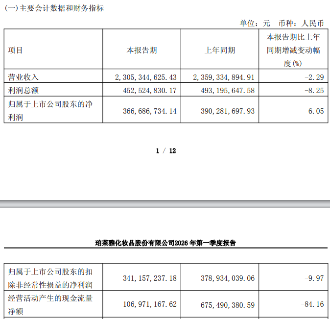 4月21日晚间,珀莱雅(603605)公布2025年年报以及2026年一季报。两份财报均显示,公司营收微降,净利润双双小幅下滑。