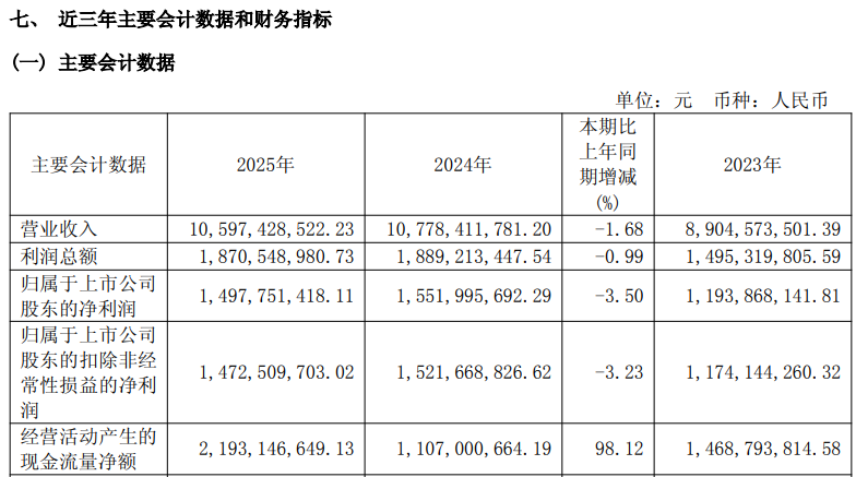 费用方面,销售费用同比增加0.98亿元,增长1.91%,主要系本期的形象宣传推广费同比增加0.64亿元,同比增长1.39%;管理费用同比增加0.38亿元,增长10.30%,主要系职工薪酬及劳务费同比增加0.33亿元,同比增长15.76%;2025年研发费用为2.17亿元,较上年同期增加646万元,占营业收入比例2.05%(上年同期占比为1.95%),变动原因主要系公司持续加大研发投入。