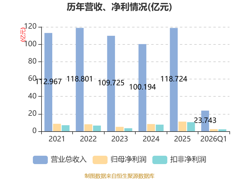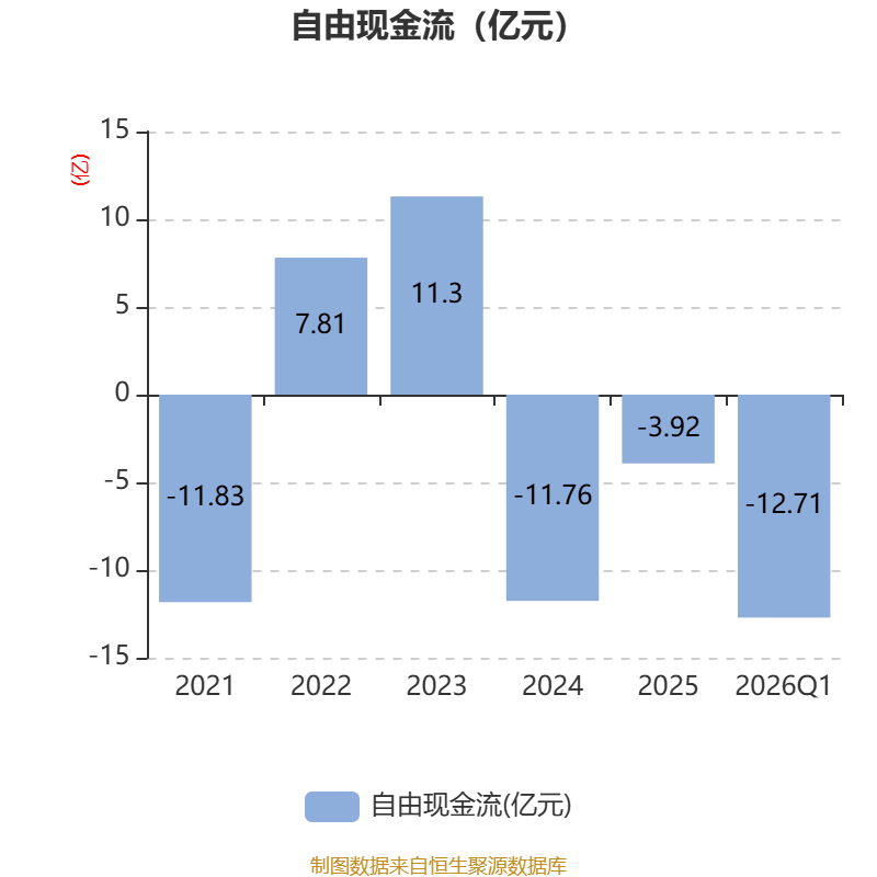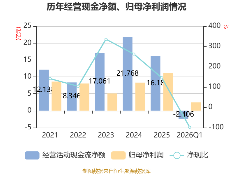 截至2026年一季度末,公司经营活动现金流净额为-2.41亿元,同比减少1.04亿元;筹资活动现金流净额5.42亿元,同比增加4.05亿元;投资活动现金流净额-7.68亿元,上年同期为-2.14亿元。