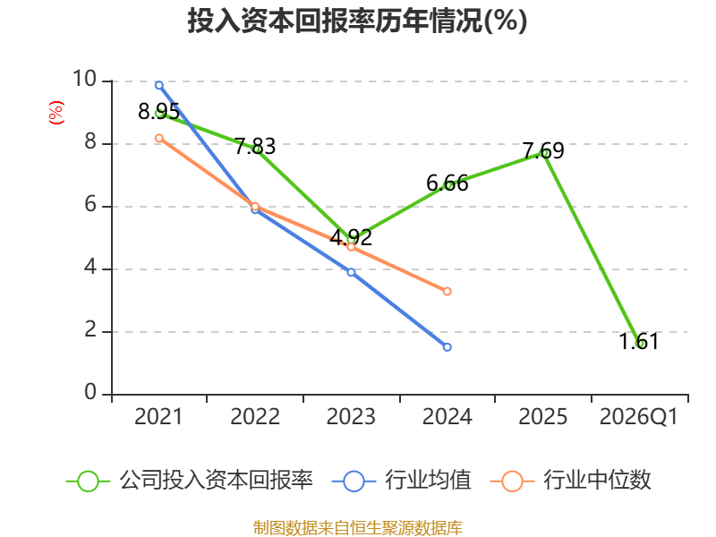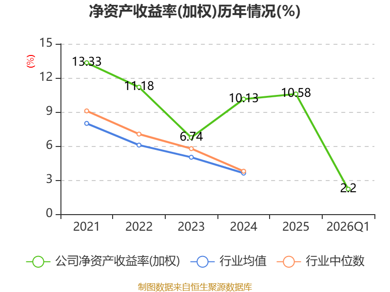 盈利能力方面, 2026年一季度公司加权平均净资产收益率为2.2%,同比上升0.4个百分点。公司2026年第一季度投入资本回报率为1.61%,较上年同期上升0.25个百分点。