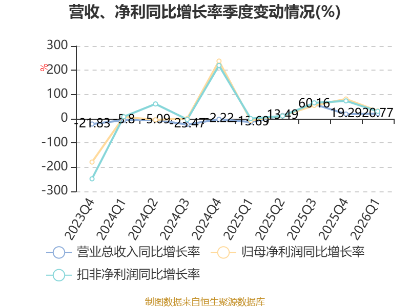 中证智能财讯龙净环保(600388)4月22日披露2026年第一季度报告。公司实现营业总收入23.74亿元,同比增长20.77%;归母净利润2.44亿元,同比增长31.89%;扣非净利润2.25亿元,同比增长30.49%;经营活动产生的现金流量净额为-2.41亿元,上年同期为-1.37亿元;报告期内,龙净环保基本每股收益为0.19元,加权平均净资产收益率为2.20%。