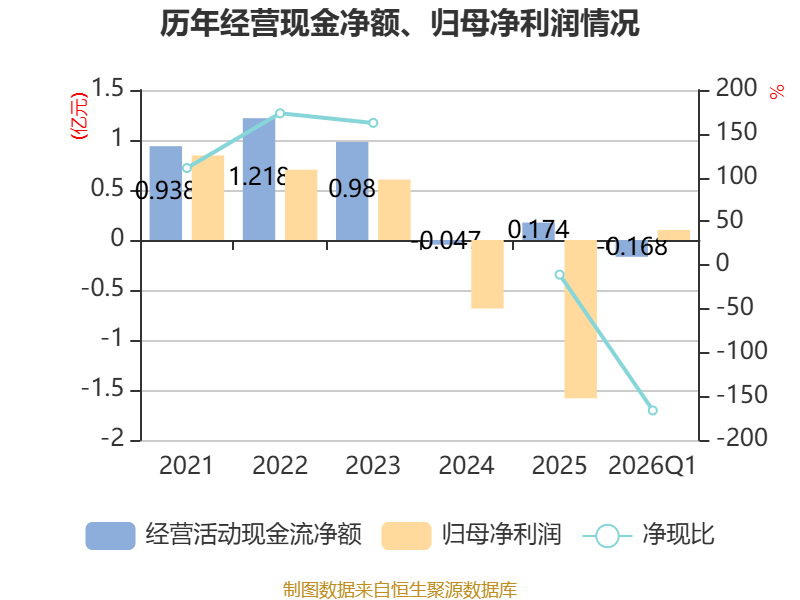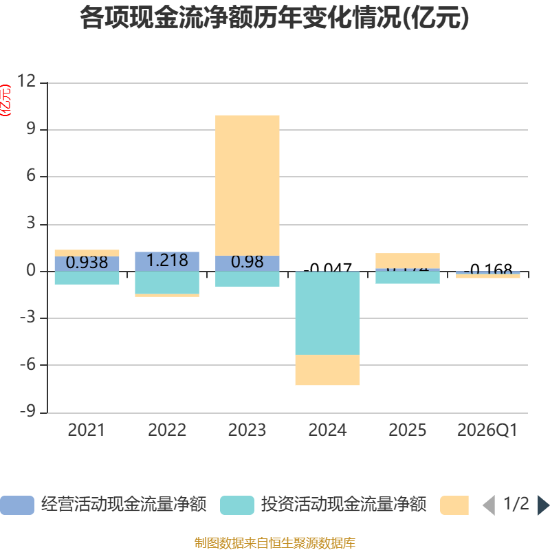 截至2026年一季度末,公司经营活动现金流净额为-1676.16万元,同比增加2077.75万元;筹资活动现金流净额-2380.04万元,同比减少5791.81万元;投资活动现金流净额-352.24万元,上年同期为7071.69万元。