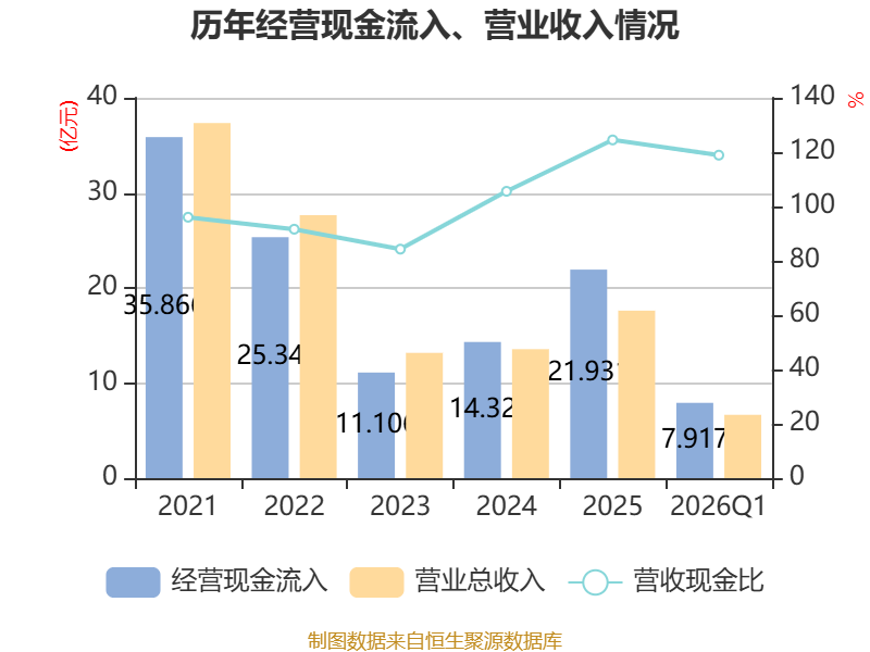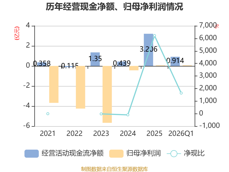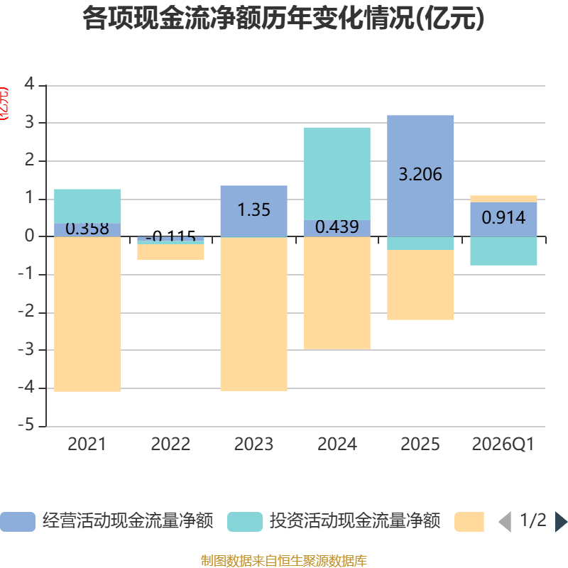 截至2026年一季度末,公司经营活动现金流净额为9137.78万元,同比下降76.02%;筹资活动现金流净额1751.02万元,同比增加1.31亿元;投资活动现金流净额-7594.28万元,上年同期为718.24万元。