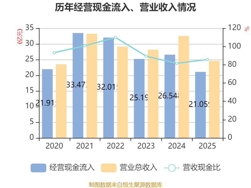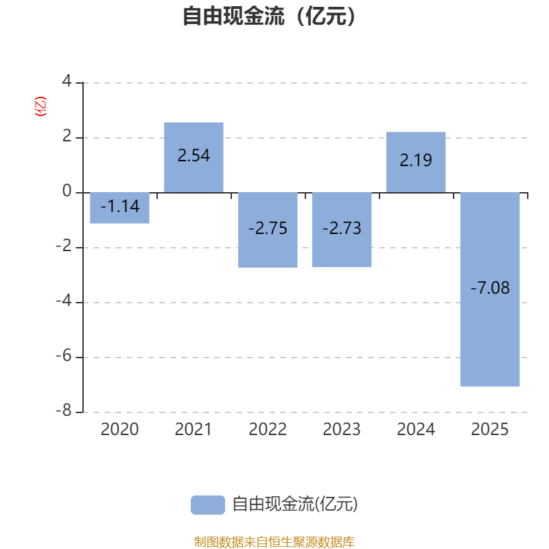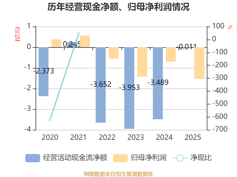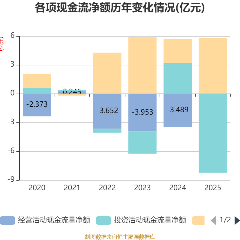 截至2025年,公司经营活动现金流净额为-114.26万元,同比增加3.48亿元;筹资活动现金流净额5.8亿元,同比增加3.29亿元;投资活动现金流净额-8.23亿元,上年同期为3.19亿元。