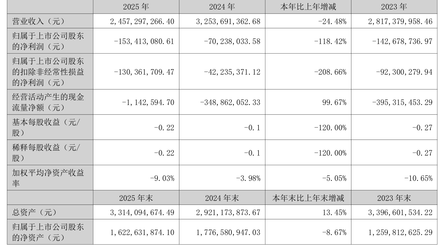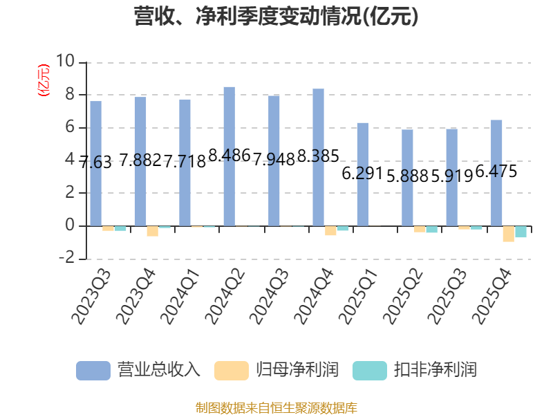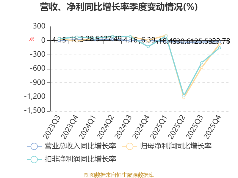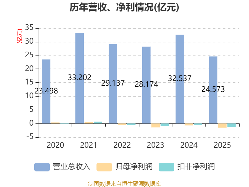 中证智能财讯恒申新材(000782)4月22日披露2025年年度报告。2025年,公司实现营业总收入24.57亿元,同比下降24.48%;归母净利润亏损1.53亿元,上年同期亏损7023.8万元;扣非净利润亏损1.3亿元,上年同期亏损4223.54万元;经营活动产生的现金流量净额为-114.26万元,上年同期为-3.49亿元;报告期内,恒申新材基本每股收益为-0.22元,加权平均净资产收益率为-9.03%。
