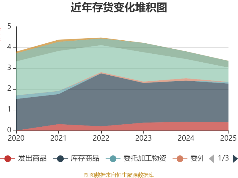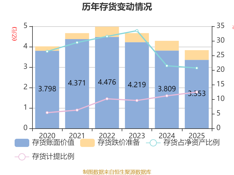 从存货变动来看,截至2025年末,公司存货账面价值为3.35亿元,占净资产的20.67%,较上年末减少4552.12万元。其中,存货跌价准备为4761.84万元,计提比例为12.43%。