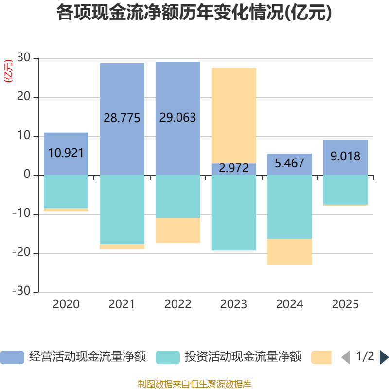 截至2025年,公司经营活动现金流净额为9.02亿元,同比增长64.95%;筹资活动现金流净额-2934.23万元,同比增加6.32亿元;投资活动现金流净额-7.61亿元,上年同期为-16.39亿元。