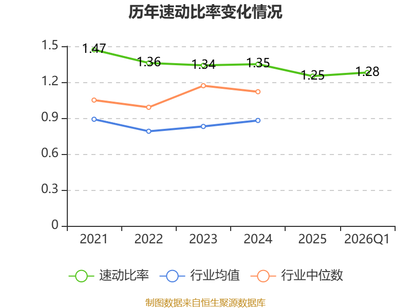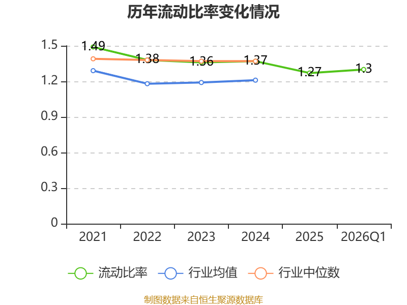 2026年第一季度,公司流动比率为1.3,速动比率为1.28。