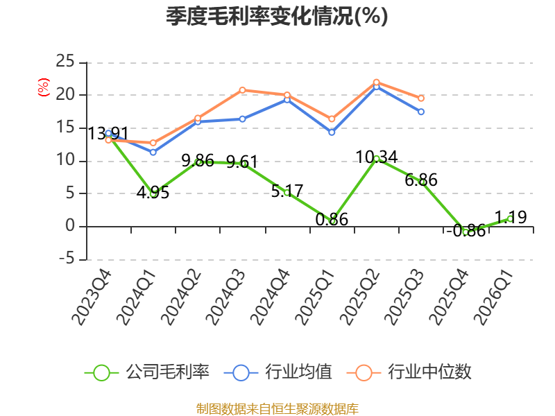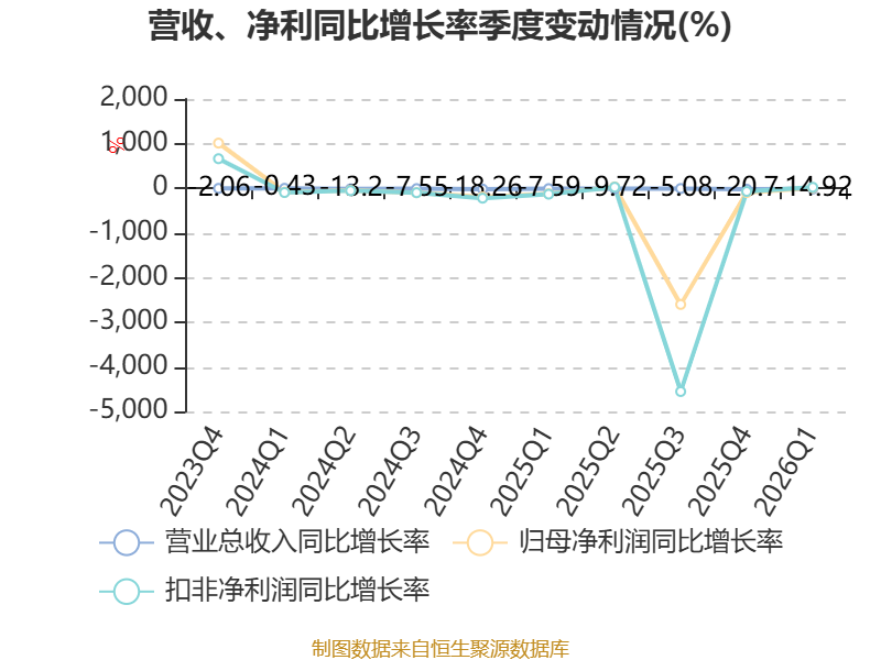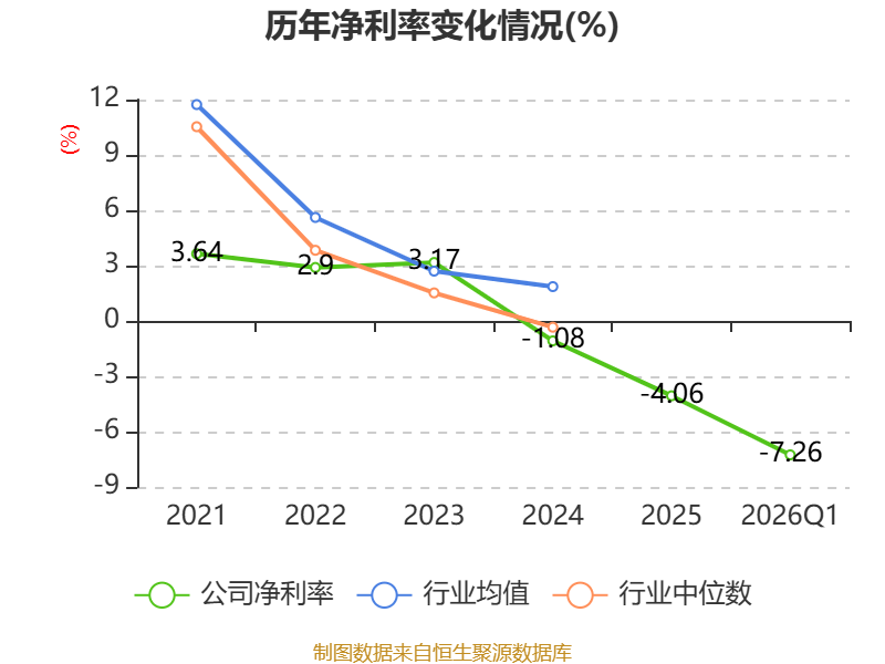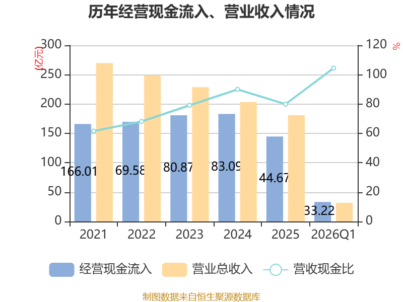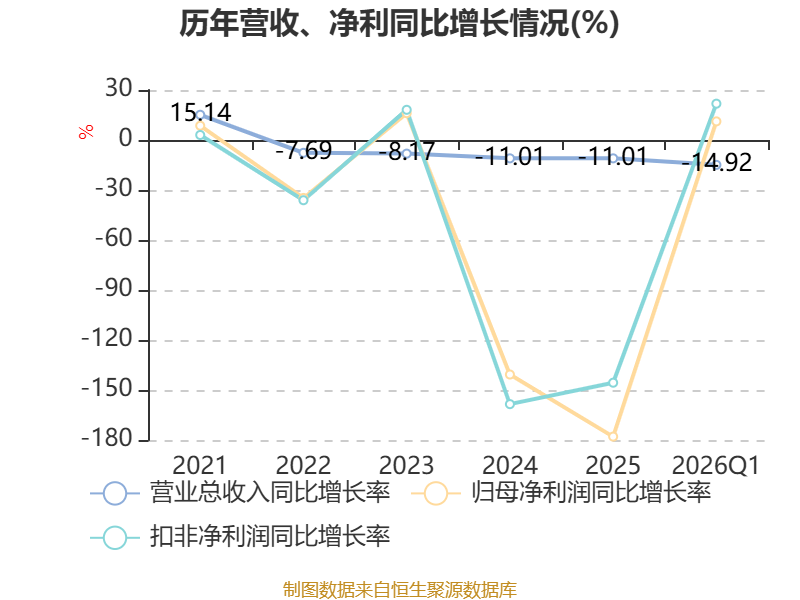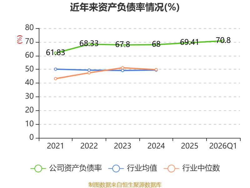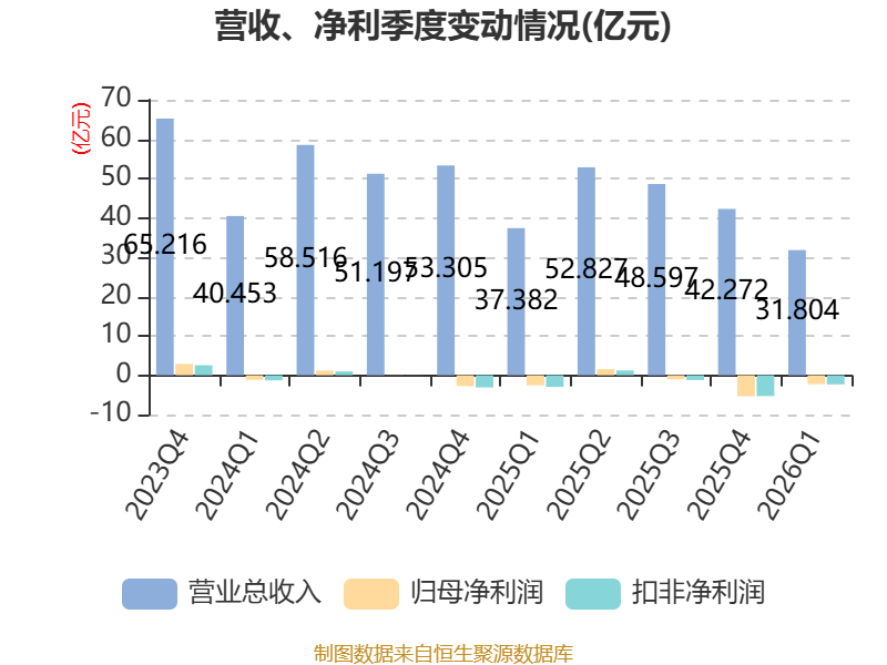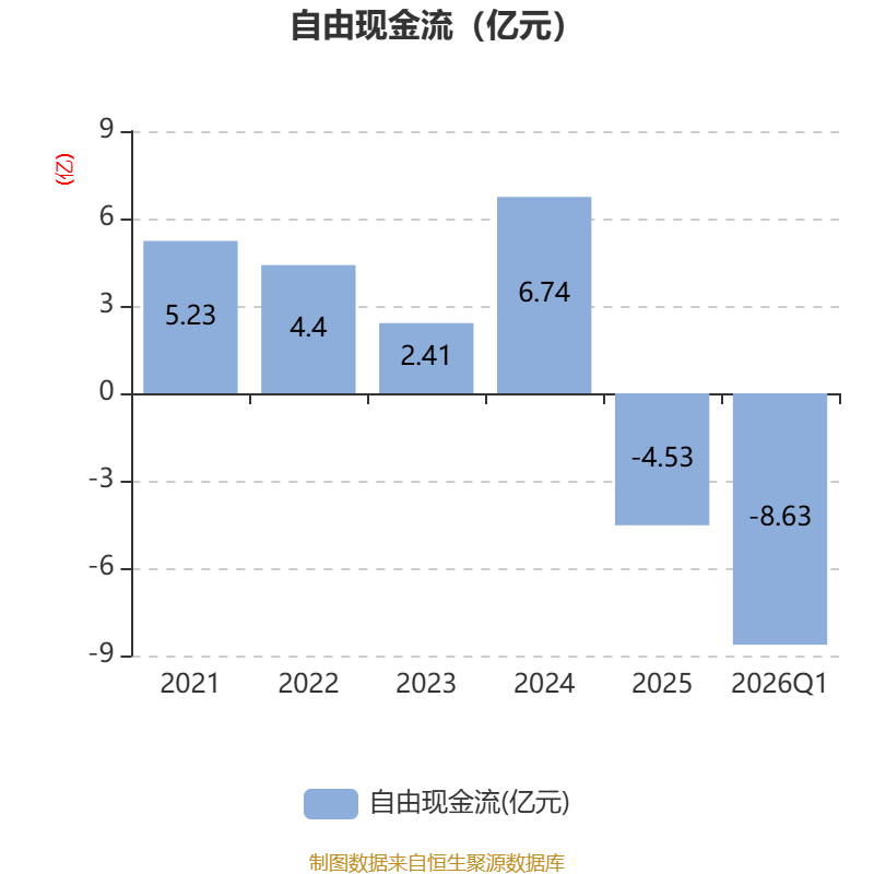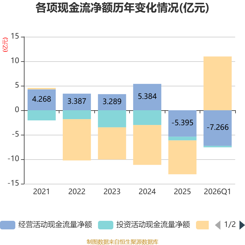 截至2026年一季度末,公司经营活动现金流净额为-7.27亿元,同比增加5.75亿元;筹资活动现金流净额10.97亿元,同比增加10.35亿元;投资活动现金流净额-3014.06万元,上年同期为-3945.07万元。