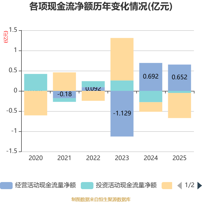 截至2025年,公司经营活动现金流净额为6521.96万元,同比下降5.74%;筹资活动现金流净额-6219.89万元,同比减少3851.83万元;投资活动现金流净额-497.18万元,上年同期为-2791.68万元。