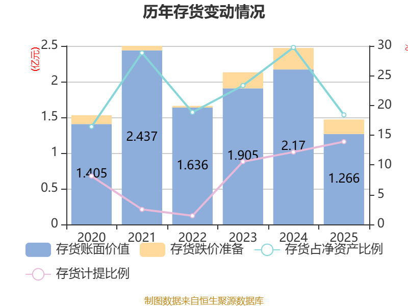 从存货变动来看,截至2025年末,公司存货账面价值为1.27亿元,占净资产的18.41%,较上年末减少9045.54万元。其中,存货跌价准备为2043.88万元,计提比例为13.9%。