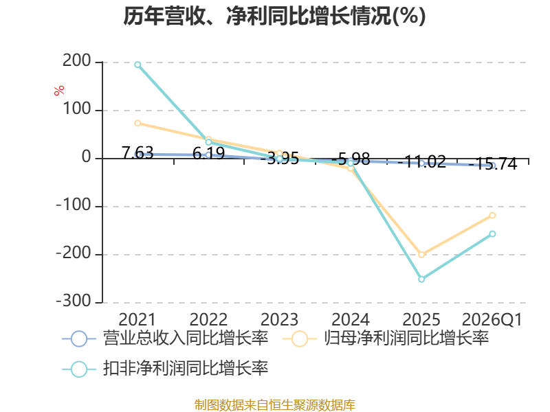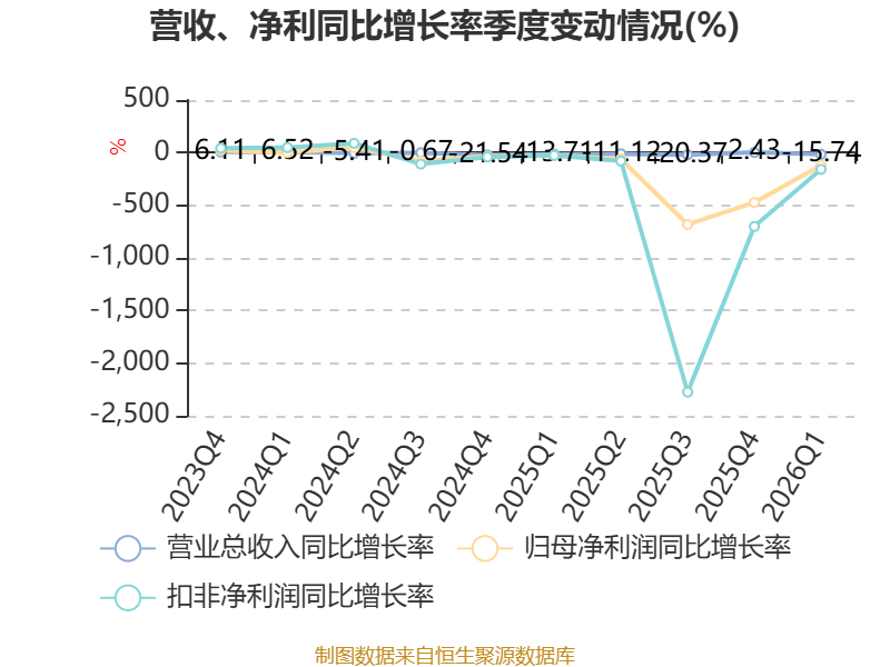 截至2026年一季度末,公司经营活动现金流净额为-2.03亿元,同比减少1.47亿元;筹资活动现金流净额7562.36万元,同比增加1.16亿元;投资活动现金流净额-74.98万元,上年同期为-1379.92万元。
