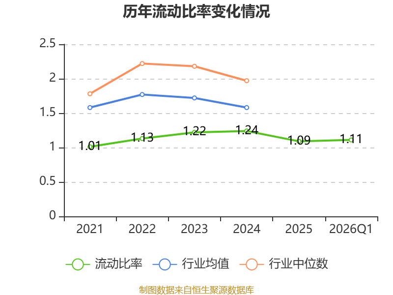 2026年第一季度,公司流动比率为1.11,速动比率为0.75。