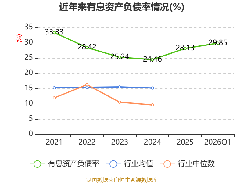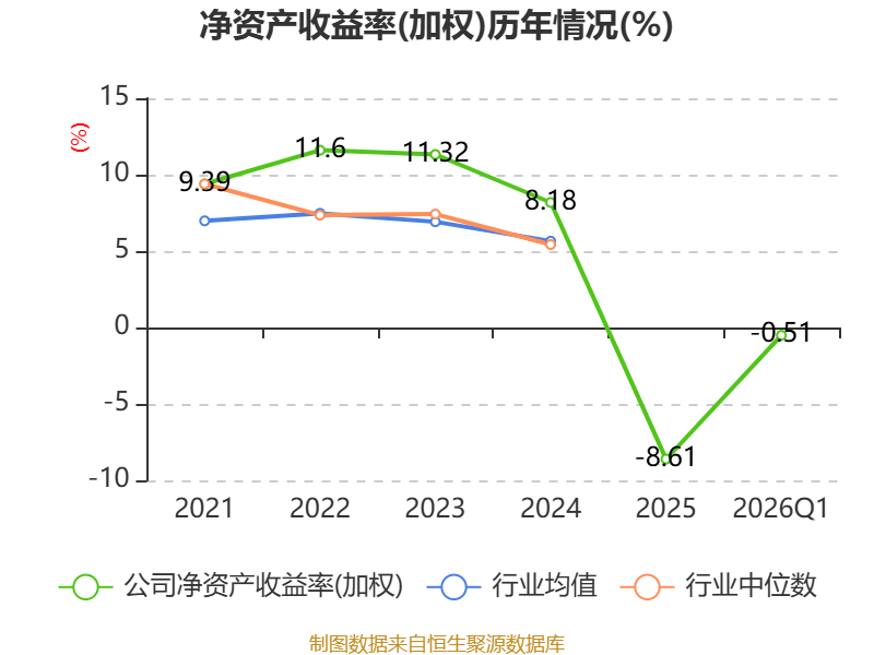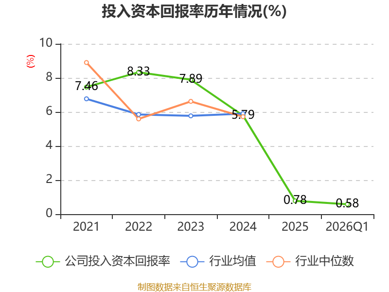 盈利能力方面, 2026年一季度公司加权平均净资产收益率为-0.51%,同比下降2.79个百分点。公司2026年第一季度投入资本回报率为0.58%,较上年同期下降0.87个百分点。