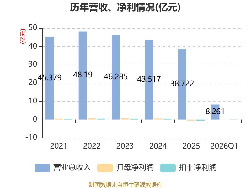 中证智能财讯瑞泰科技(002066)4月22日披露2026年第一季度报告。公司实现营业总收入8.26亿元,同比下降15.74%;归母净利润亏损319.61万元,上年同期盈利1648.54万元;扣非净利润亏损929.53万元,上年同期盈利1601.86万元;经营活动产生的现金流量净额为-2.03亿元,上年同期为-5619.37万元;报告期内,瑞泰科技基本每股收益为-0.0136元,加权平均净资产收益率为-0.51%。