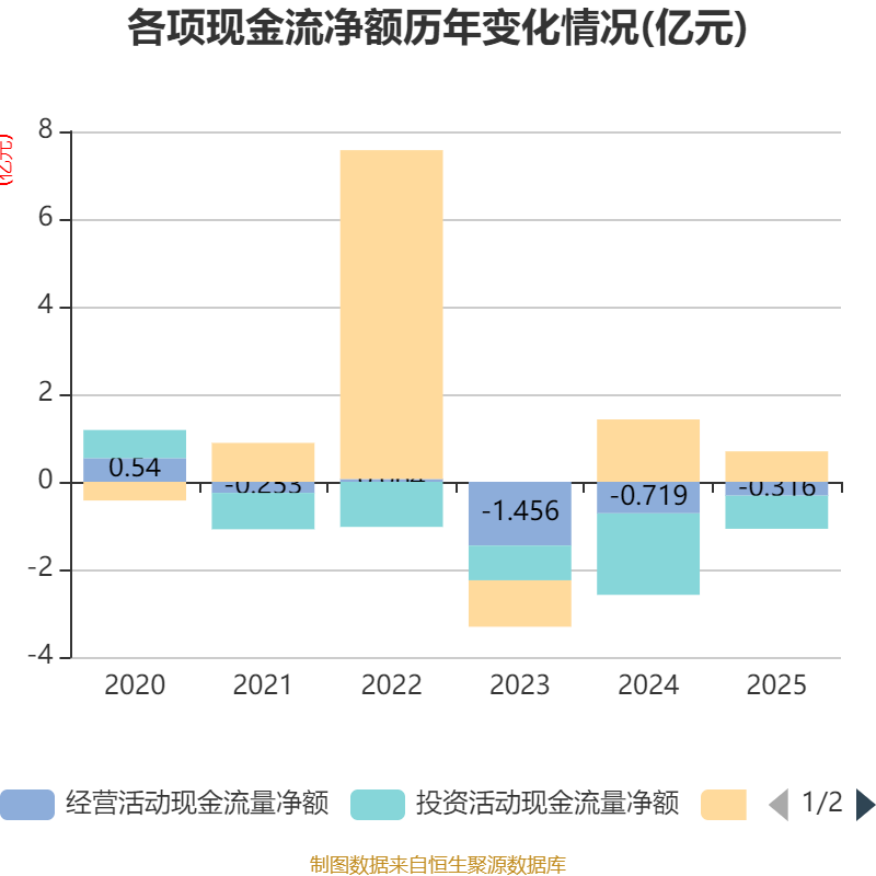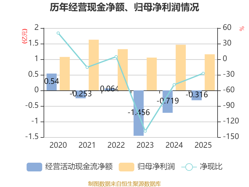 截至2025年,公司经营活动现金流净额为-3155.52万元,同比增加4034.39万元;筹资活动现金流净额6954.02万元,同比减少7283.63万元;投资活动现金流净额-7565.04万元,上年同期为-1.86亿元。
