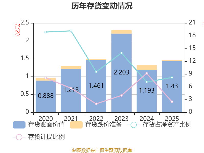 从存货变动来看,截至2025年末,公司存货账面价值为1.43亿元,占净资产的8.17%,较上年末增加2373.84万元。其中,存货跌价准备为361.17万元,计提比例为2.46%。