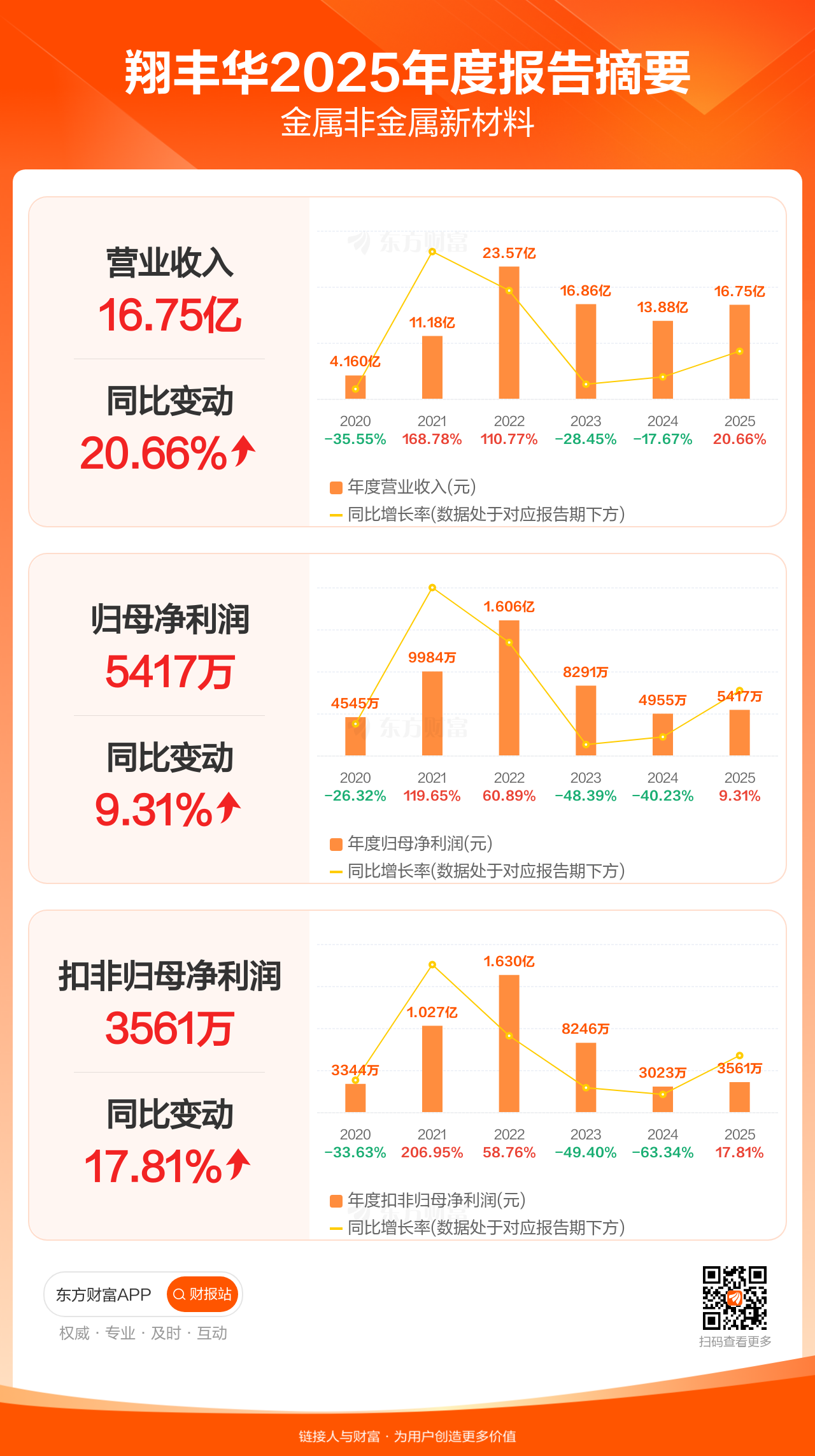 翔丰华4月22日发布2025年年报显示,公司全年实现营业收入16.75亿元,同比增长20.66%;归母净利润5416.84万元,同比增长9.31%;扣非归母净利润3561.49万元,同比增长17.81%。