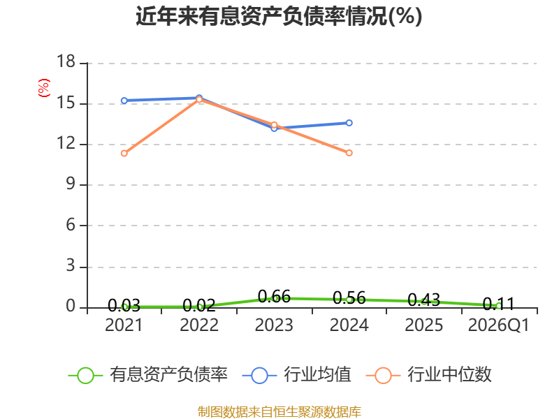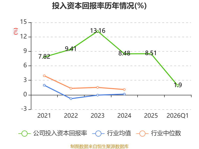 盈利能力方面, 2026年一季度公司加权平均净资产收益率为2.2%,同比下降1.32个百分点。公司2026年第一季度投入资本回报率为1.9%,较上年同期下降1.32个百分点。