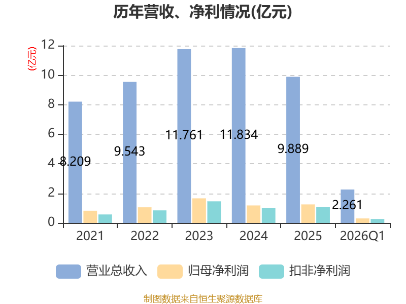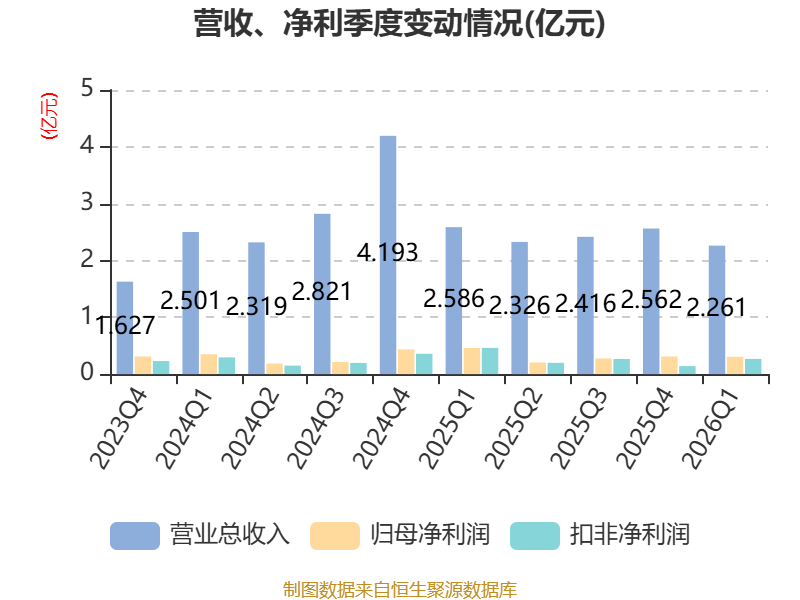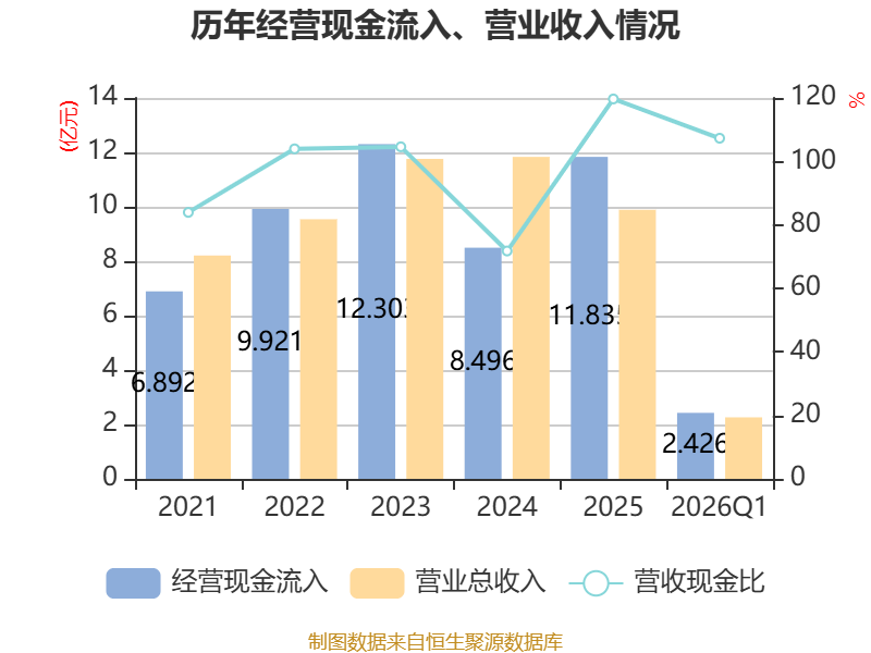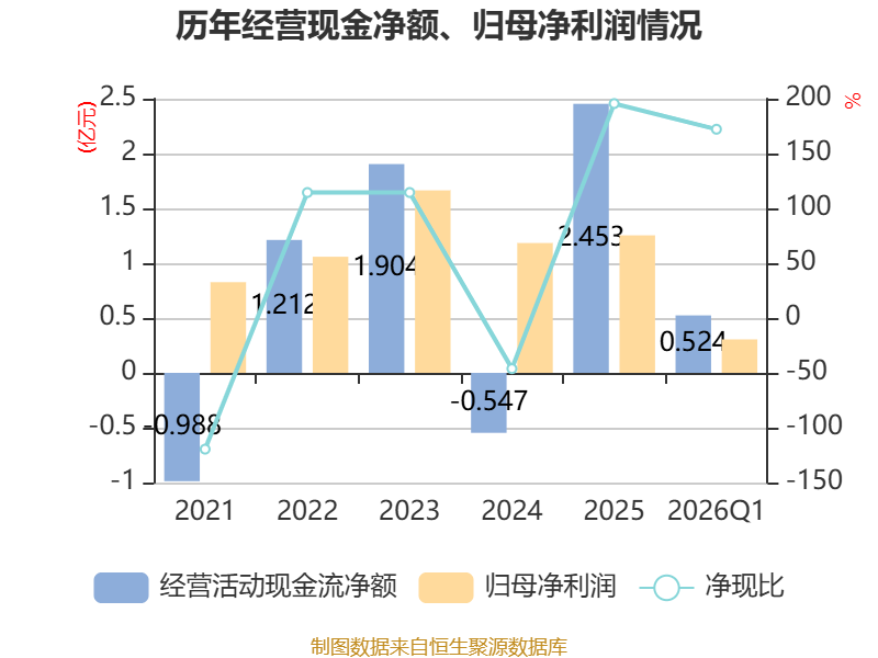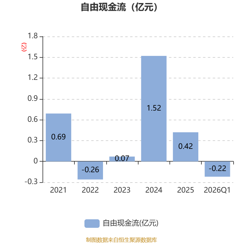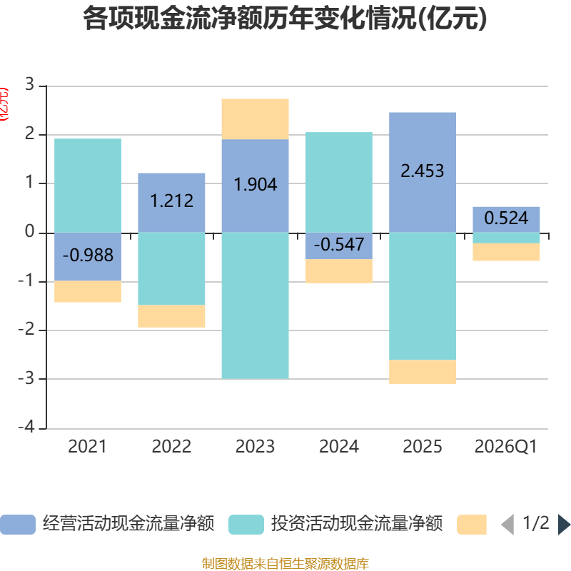 截至2026年一季度末,公司经营活动现金流净额为5244.07万元,同比增长29.48%;筹资活动现金流净额-3577.27万元,同比减少3787.61万元;投资活动现金流净额-2208.59万元,上年同期为-6604.41万元。