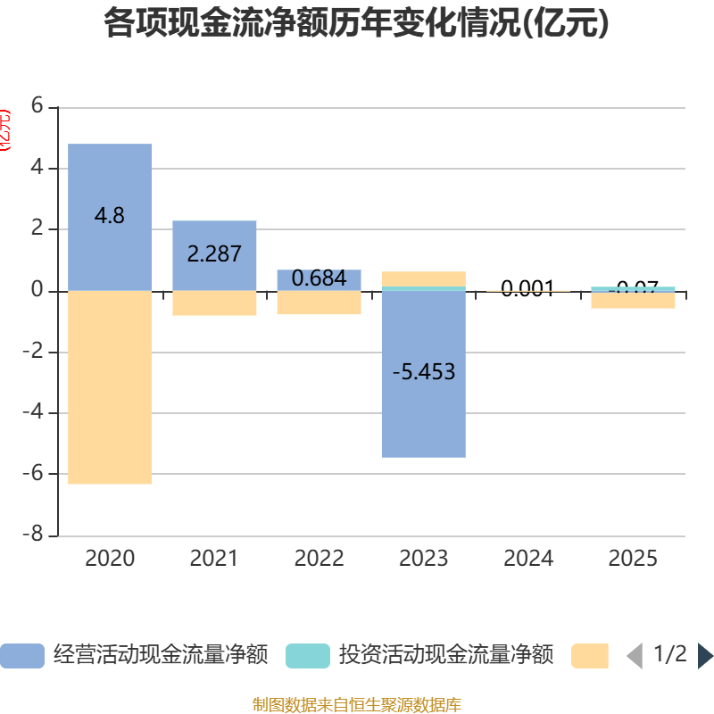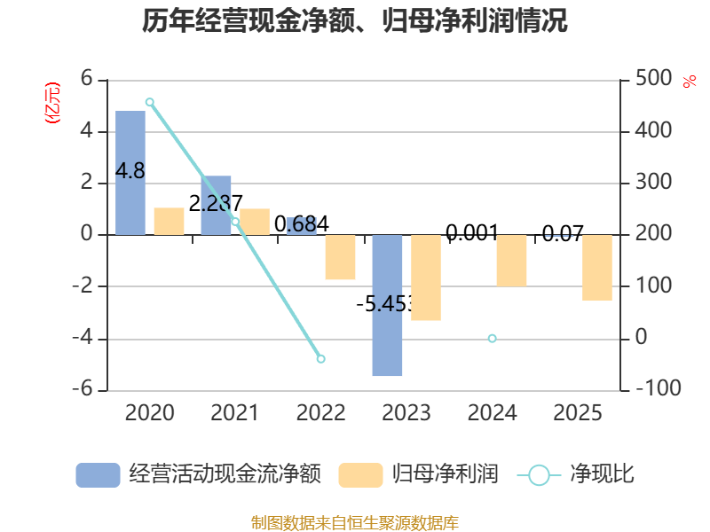 截至2025年,公司经营活动现金流净额为-700.28万元,同比减少706.97万元;筹资活动现金流净额-5076.82万元,同比减少4766.07万元;投资活动现金流净额1314.84万元,上年同期为-29.93万元。
