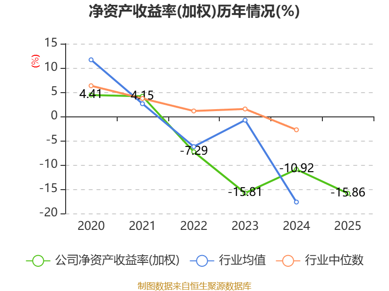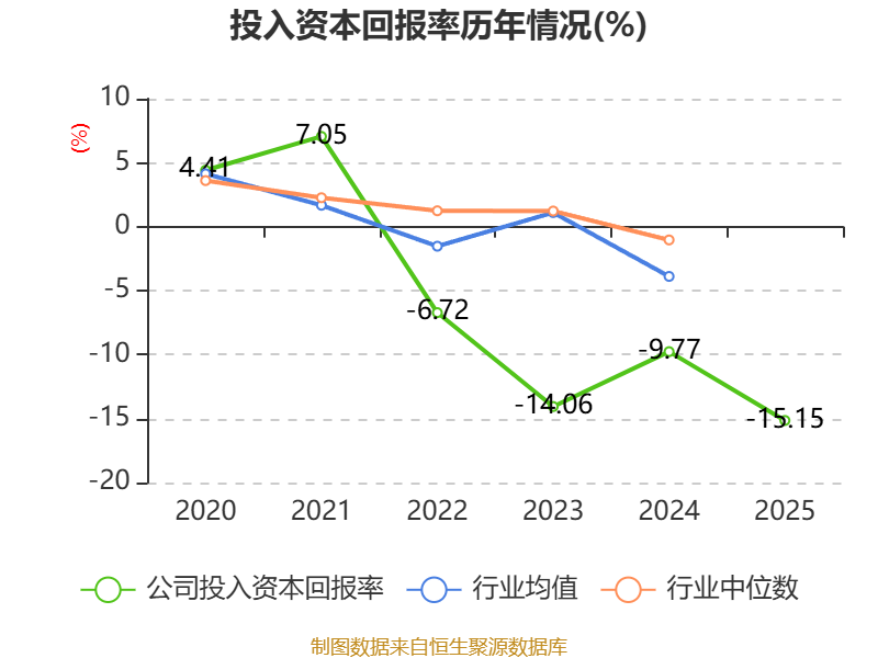 数据显示,2025年公司加权平均净资产收益率为-15.86%,较上年同期下降4.94个百分点。公司2025年投入资本回报率为-15.15%,较上年同期下降5.38个百分点。