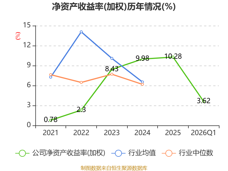 盈利能力方面, 2026年一季度公司加权平均净资产收益率为3.62%,同比上升0.26个百分点。公司2026年第一季度投入资本回报率为3.51%,较上年同期上升0.21个百分点。
