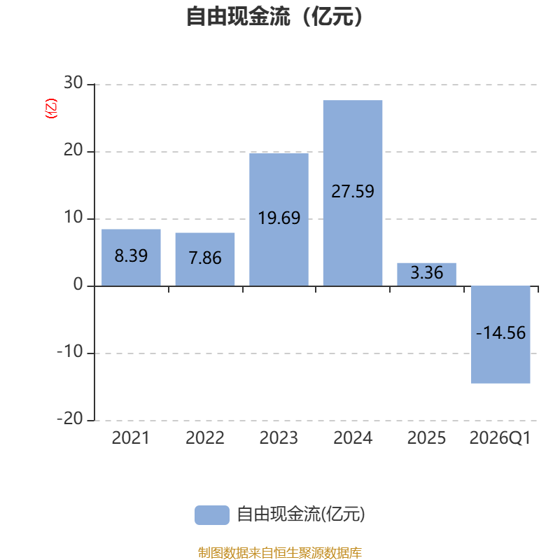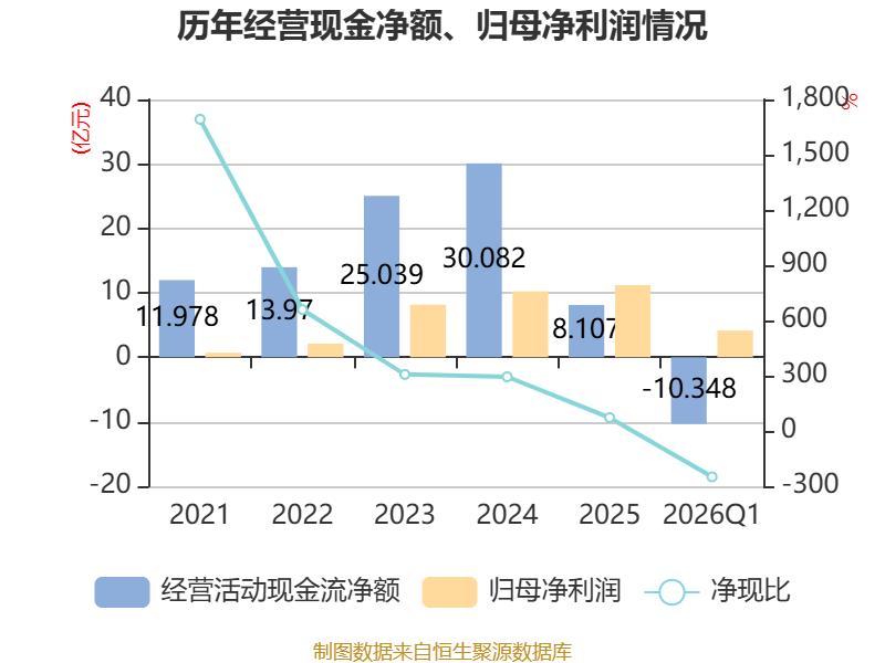 截至2026年一季度末,公司经营活动现金流净额为-10.35亿元,同比减少4.87亿元;筹资活动现金流净额-307.48万元,同比增加1.13亿元;投资活动现金流净额-6250.64万元,上年同期为-1716.15万元。