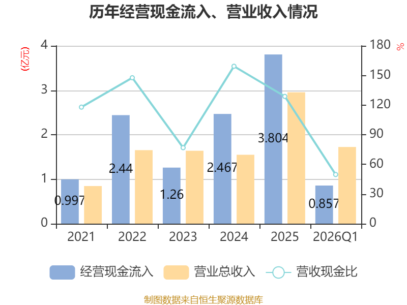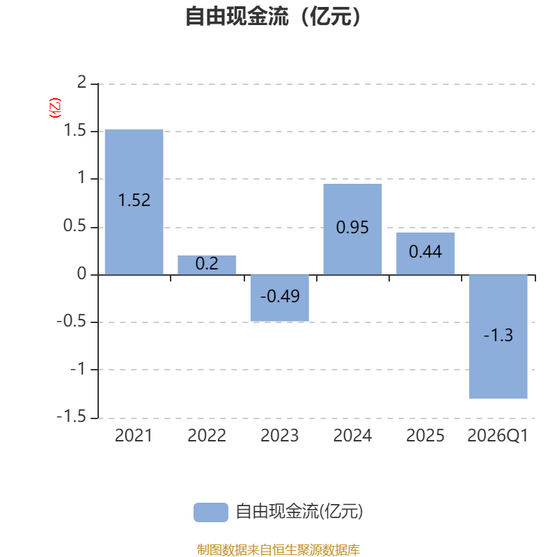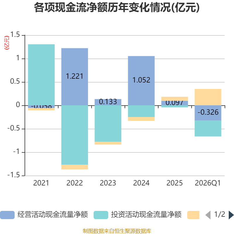 截至2026年一季度末,公司经营活动现金流净额为-3260.81万元,同比减少1565.8万元;筹资活动现金流净额3500万元,同比增加2737.55万元;投资活动现金流净额-3398.21万元,上年同期为-3236.06万元。