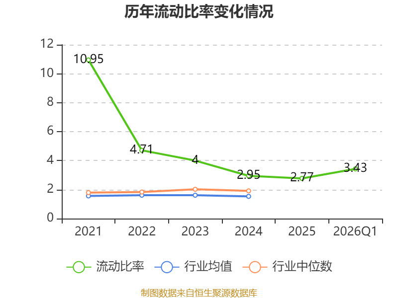 2026年第一季度,公司流动比率为3.43,速动比率为3.09。