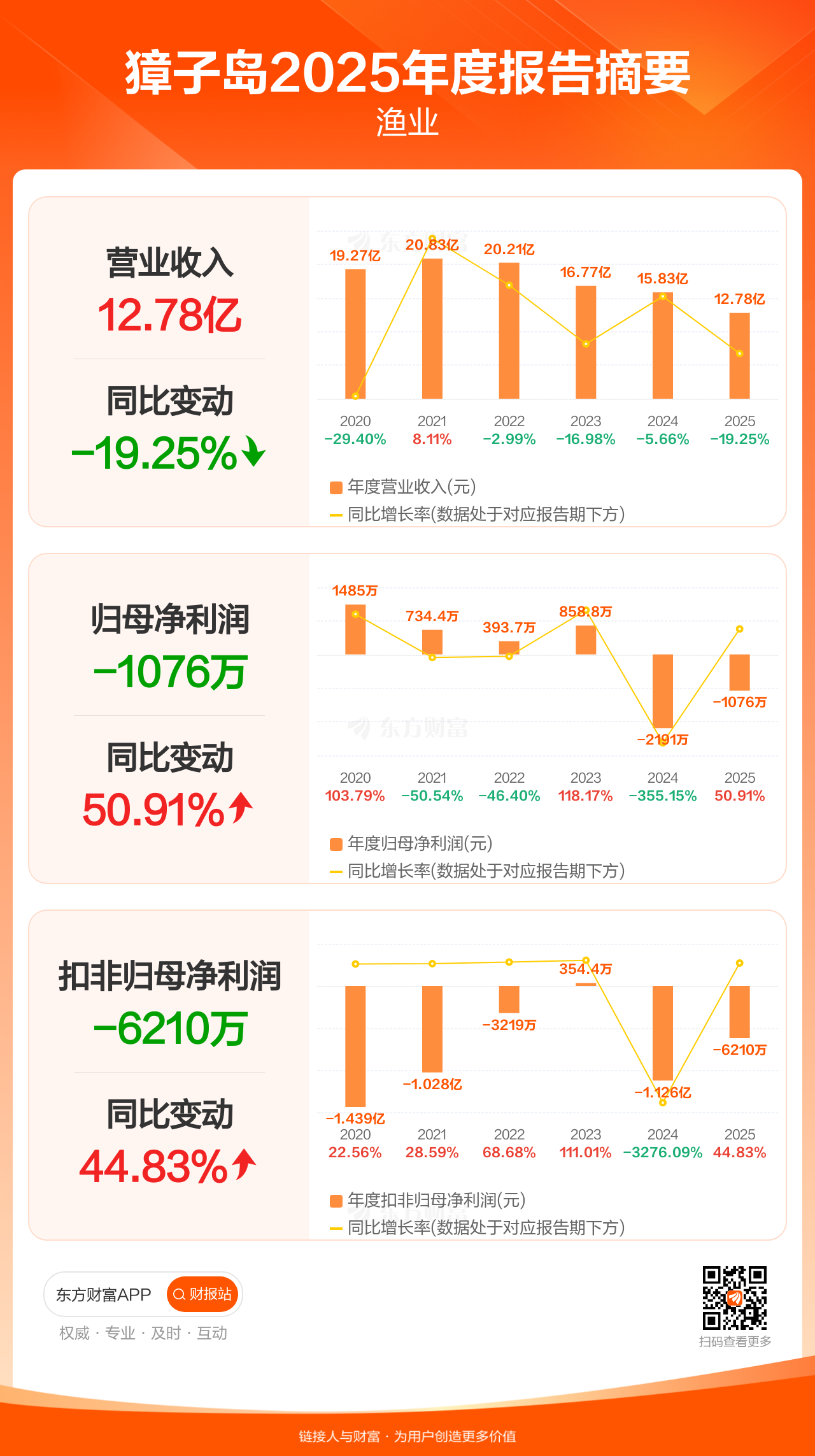 獐子岛4月22日发布2025年年报显示,公司全年实现营业收入12.78亿元,同比下滑19.25%;归母净利润-1075.64万元;扣非归母净利润-6210.48万元。