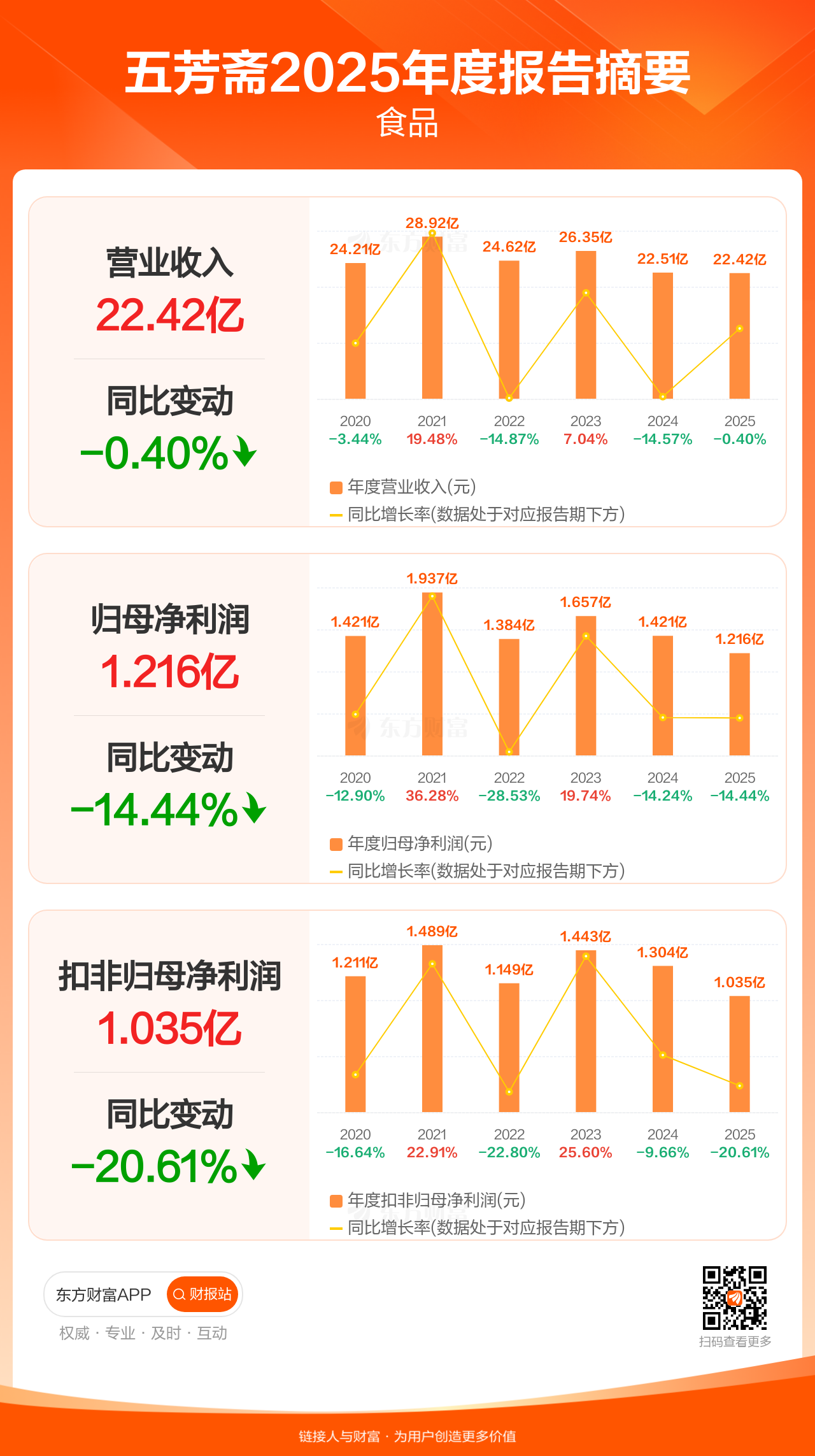 五芳斋4月22日发布2025年年报显示,公司全年实现营业收入22.42亿元,同比下滑0.40%;归母净利润1.22亿元,同比下滑14.44%;扣非归母净利润1.04亿元,同比下滑20.61%。