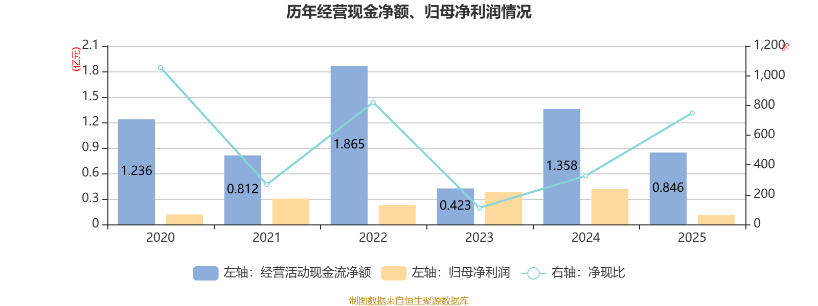2025年,公司经营活动现金流净额为8455.9万元,同比下降37.74%;筹资活动现金流净额-3081.5万元,同比增加1679.7万元;投资活动现金流净额-2010.5万元,上年同期为-2763.6万元。