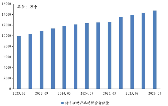 与收益缩水形成反差的是,理财投资者数量不降反增。截至一季度末,全市场理财投资者总量达1.48亿个,同比增加17.46%,较2025年末单季新增500万个。