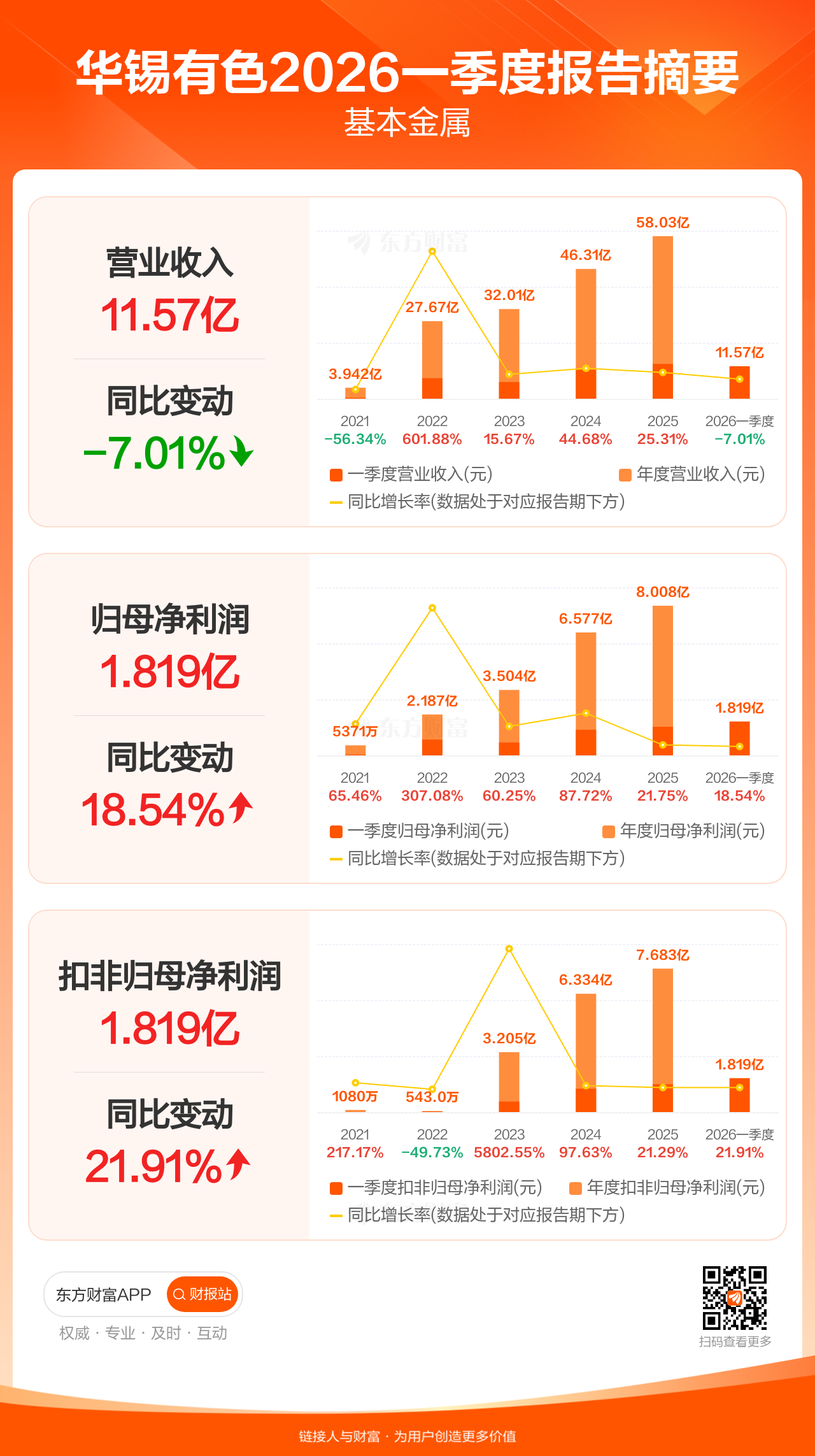 华锡有色4月22日发布2026年一季报显示,公司一季度实现营业收入11.57亿元,同比下滑7.01%;归母净利润1.82亿元,同比增长18.54%;扣非归母净利润1.82亿元,同比增长21.91%。