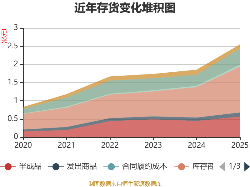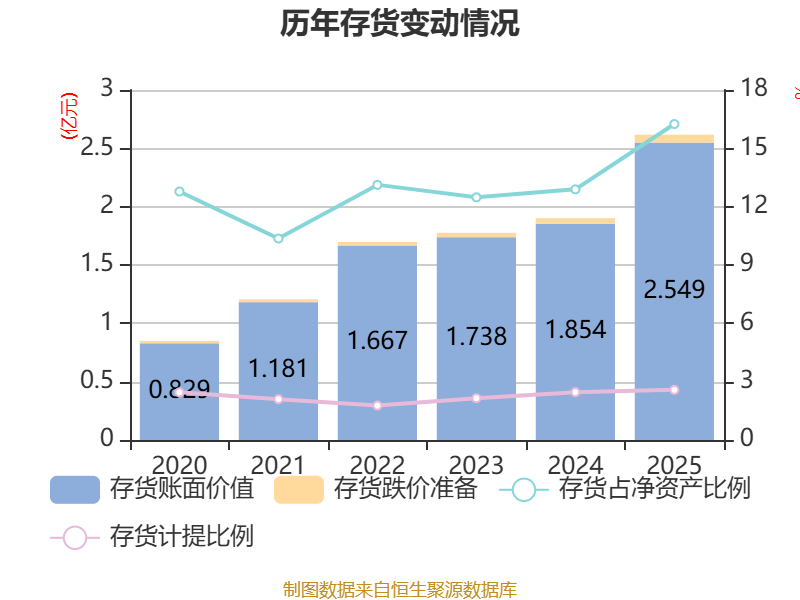 从存货变动来看,截至2025年末,公司存货账面价值为2.55亿元,占净资产的16.25%,较上年末增加6945.01万元。其中,存货跌价准备为676.15万元,计提比例为2.58%。