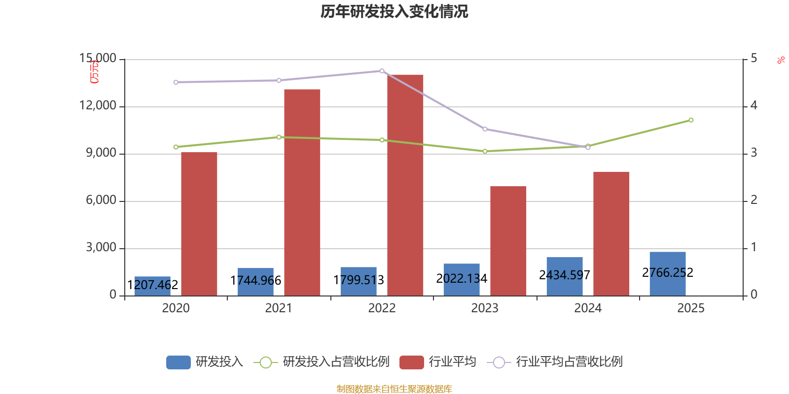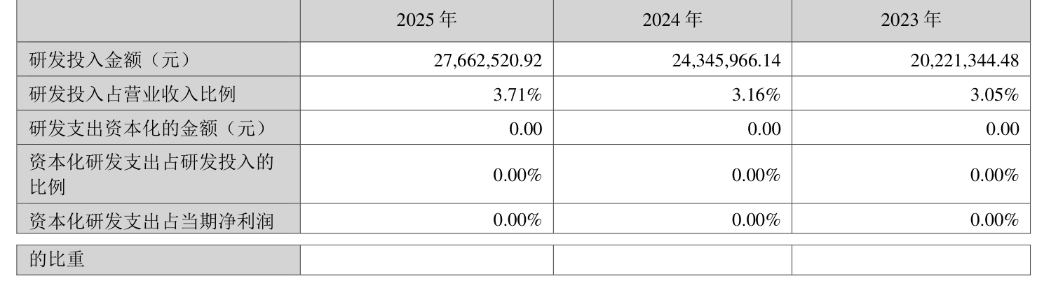 2025年全年,公司研发投入金额为2766.25万元,同比增长13.62%;研发投入占营业收入比例为3.71%,相比上年同期上升0.55个百分点。此外,公司全年研发投入资本化率为0%。