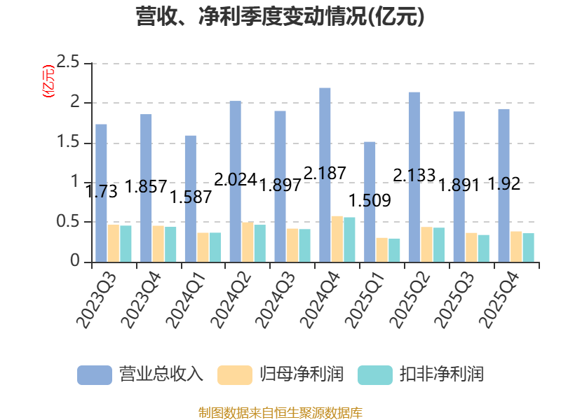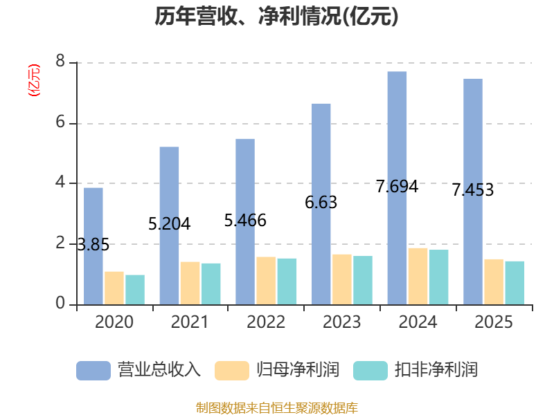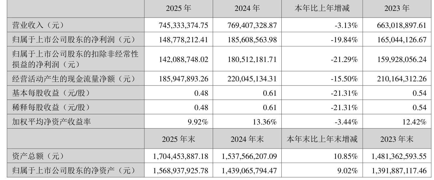 中证智能财讯玉马科技(300993)4月22日披露2025年年度报告。2025年,公司实现营业总收入7.45亿元,同比下降3.13%;归母净利润1.49亿元,同比下降19.84%;扣非净利润1.42亿元,同比下降21.29%;经营活动产生的现金流量净额为1.86亿元,同比下降15.50%;报告期内,玉马科技基本每股收益为0.48元,加权平均净资产收益率为9.92%。公司2025年度分配预案为:拟向全体股东每10股派现2元(含税)。