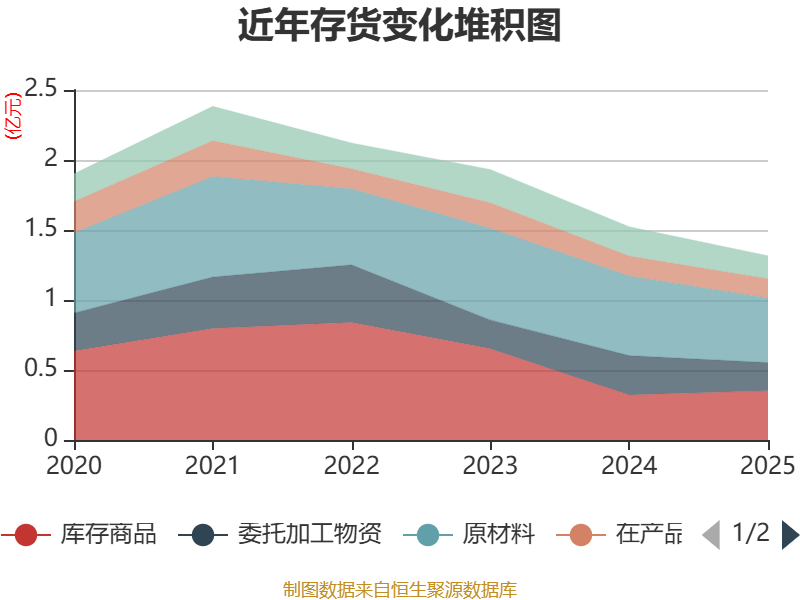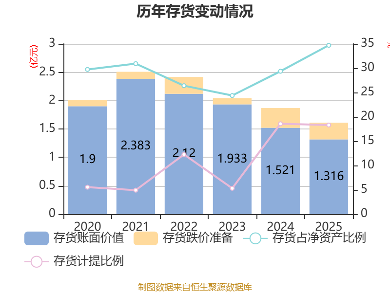 从存货变动来看,截至2025年末,公司存货账面价值为1.32亿元,占净资产的34.69%,较上年末减少2058.17万元。其中,存货跌价准备为2949.27万元,计提比例为18.31%。