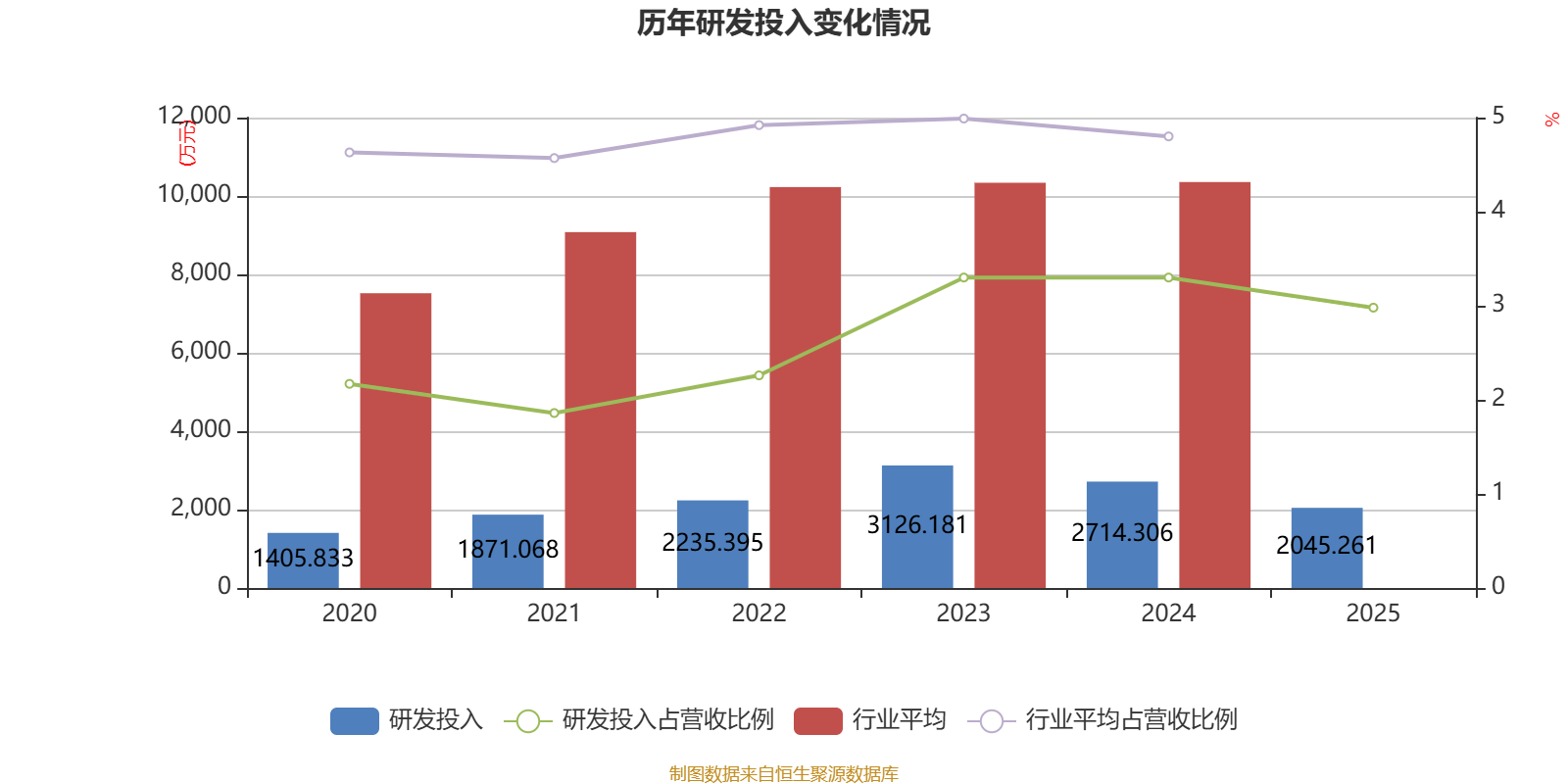 2025年全年,公司研发投入金额为2045.26万元,同比下降24.65%;研发投入占营业收入比例为2.98%,相比上年同期下降0.32个百分点。此外,公司全年研发投入资本化率为0%。