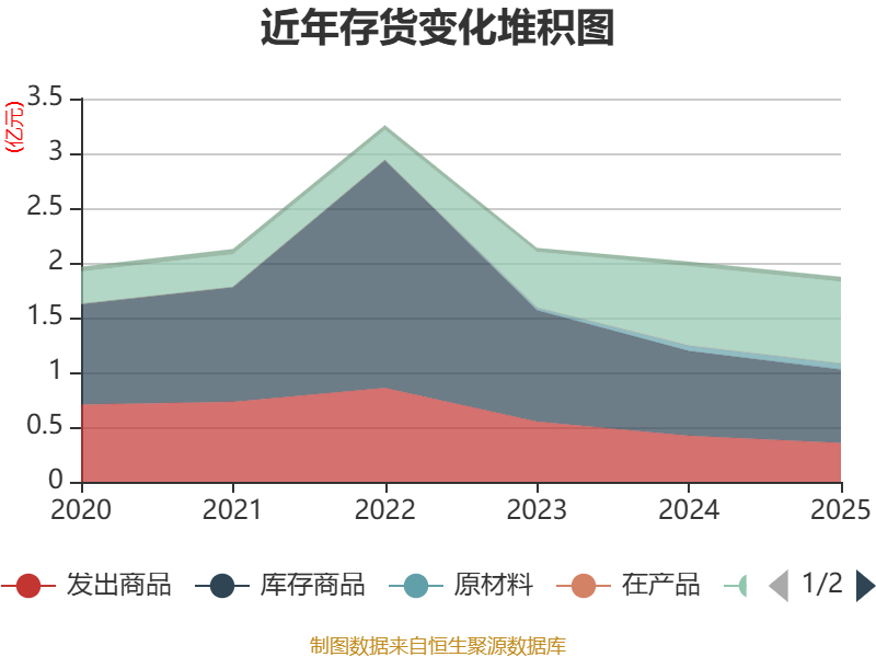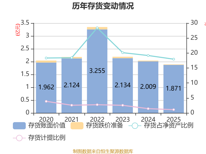 从存货变动来看,截至2025年末,公司存货账面价值为1.87亿元,占净资产的17.96%,较上年末减少1384.45万元。其中,存货跌价准备为208.01万元,计提比例为1.1%。