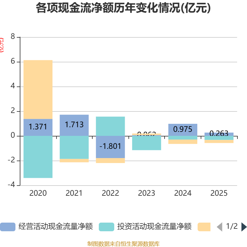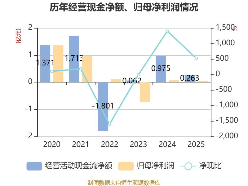 截至2025年,公司经营活动现金流净额为2625.17万元,同比下降73.09%;筹资活动现金流净额-2476.11万元,同比增加1031.63万元;投资活动现金流净额-3316.76万元,上年同期为-3017.13万元。