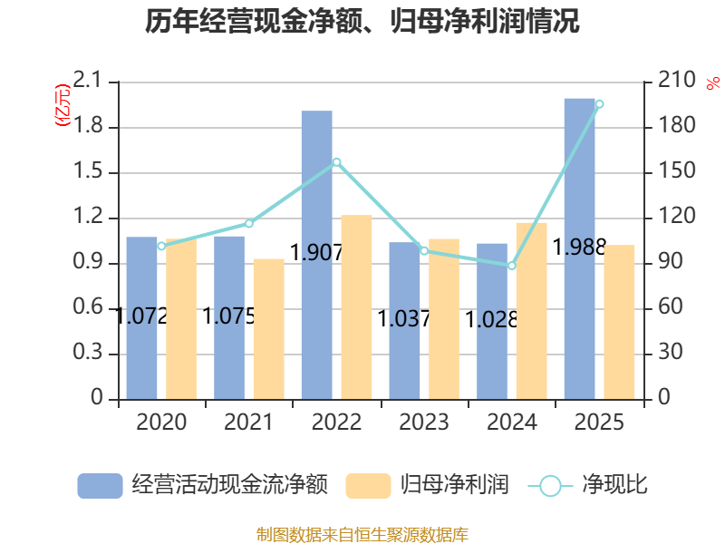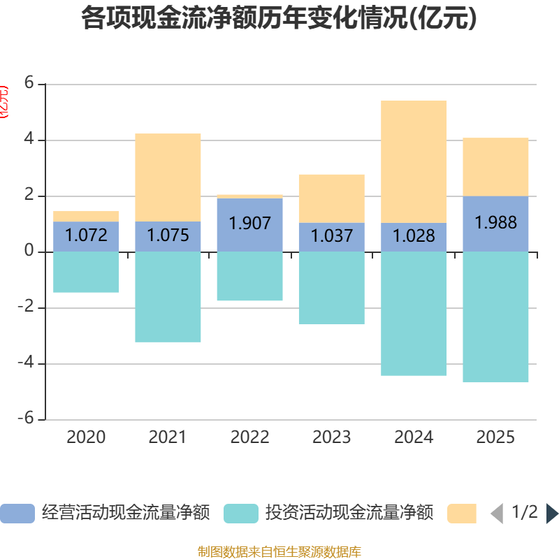 截至2025年,公司经营活动现金流净额为1.99亿元,同比增长93.51%;筹资活动现金流净额2.08亿元,同比减少2.29亿元;投资活动现金流净额-4.68亿元,上年同期为-4.44亿元。