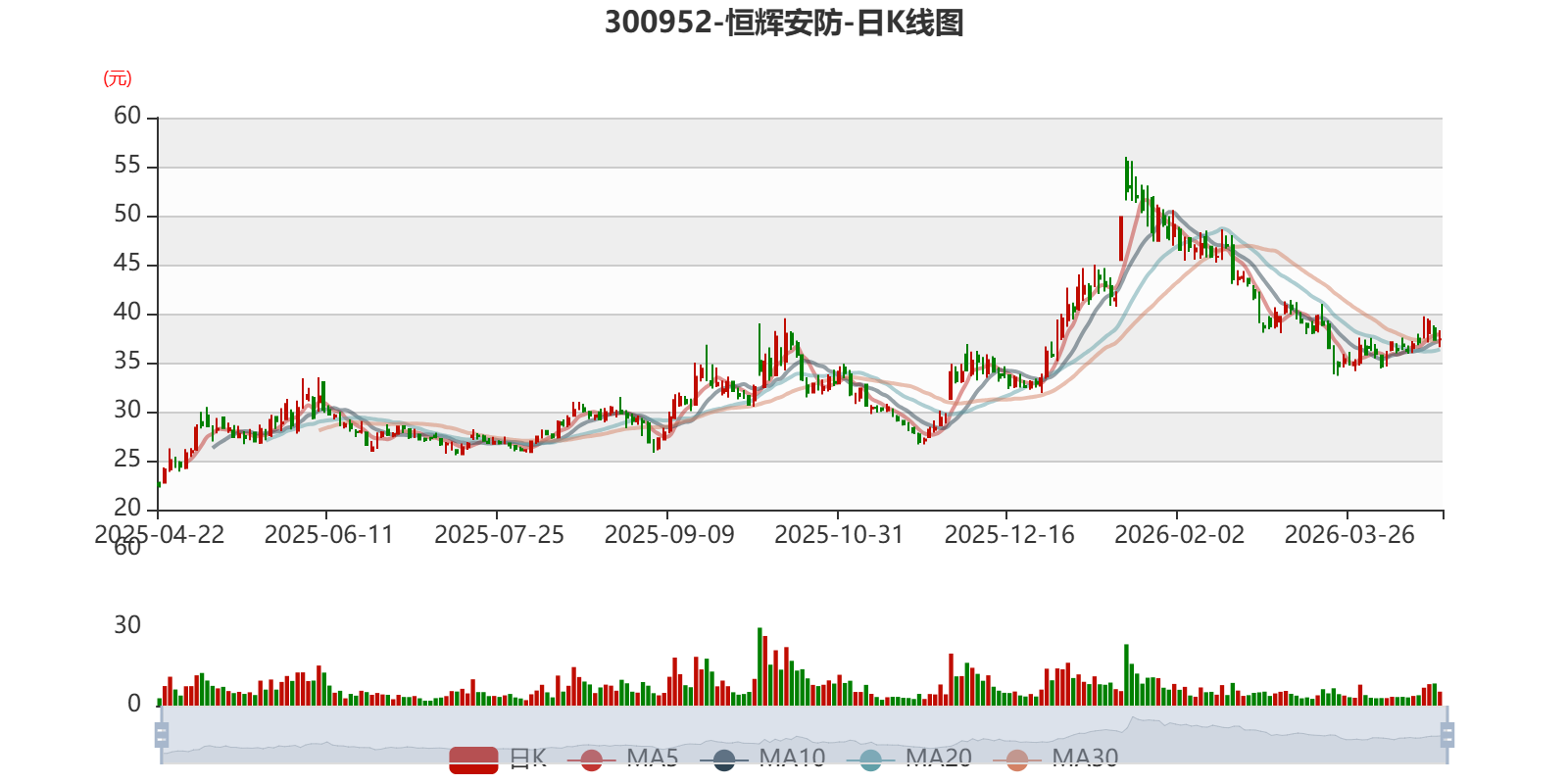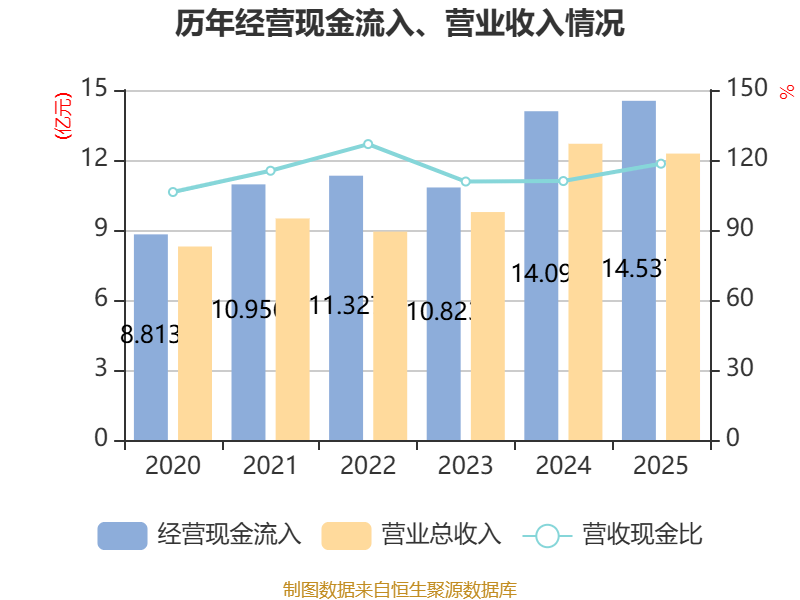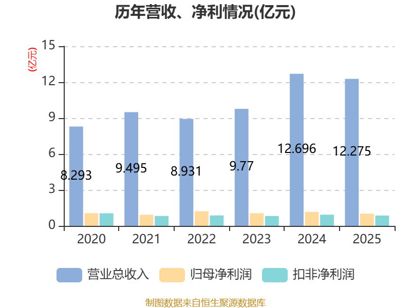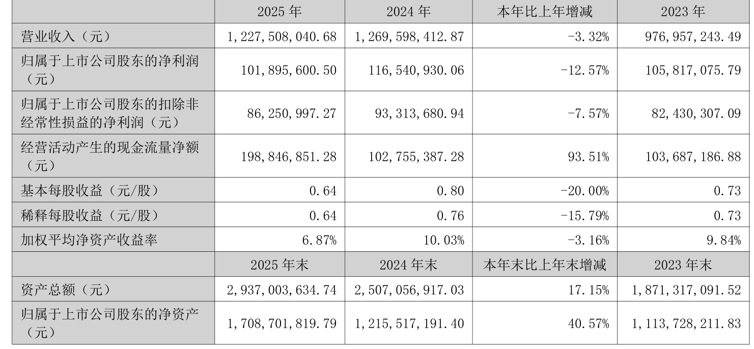 中证智能财讯恒辉安防(300952)4月22日披露2025年年度报告。2025年,公司实现营业总收入12.28亿元,同比下降3.32%;归母净利润1.02亿元,同比下降12.57%;扣非净利润8625.1万元,同比下降7.57%;经营活动产生的现金流量净额为1.99亿元,同比增长93.51%;报告期内,恒辉安防基本每股收益为0.64元,加权平均净资产收益率为6.87%。公司2025年度分配预案为:拟向全体股东每10股转4股,派现1.25元(含税)。
