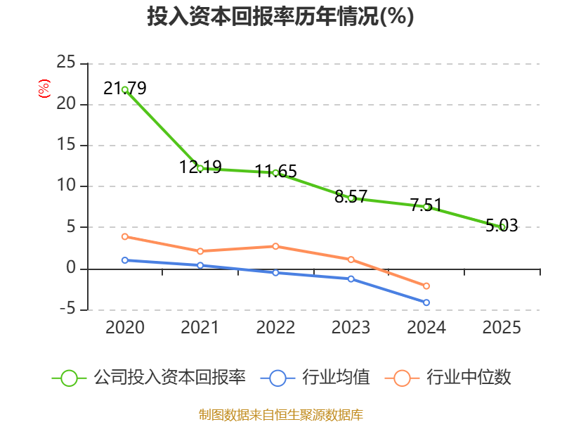 数据显示,2025年公司加权平均净资产收益率为6.87%,较上年同期下降3.16个百分点。公司2025年投入资本回报率为5.03%,较上年同期下降2.48个百分点。