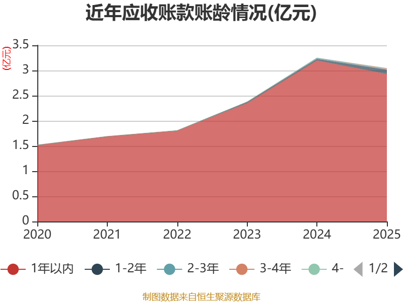 从应收账款账龄结构来看,截至2025年末,公司账龄在1年以内的应收账款余额为2.93亿元,较上年末下降2704.95万元,占应收账款总额比例为96.21%,较上年末下降2.2个百分点。