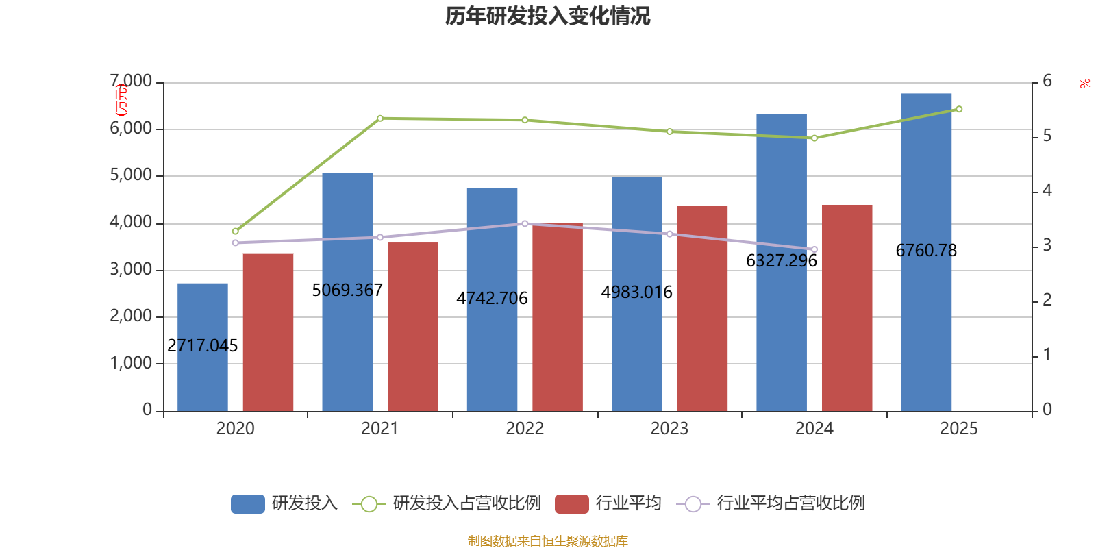 2025年全年,公司研发投入金额为6760.78万元,同比增长6.85%;研发投入占营业收入比例为5.51%,相比上年同期上升0.53个百分点。此外,公司全年研发投入资本化率为0%。