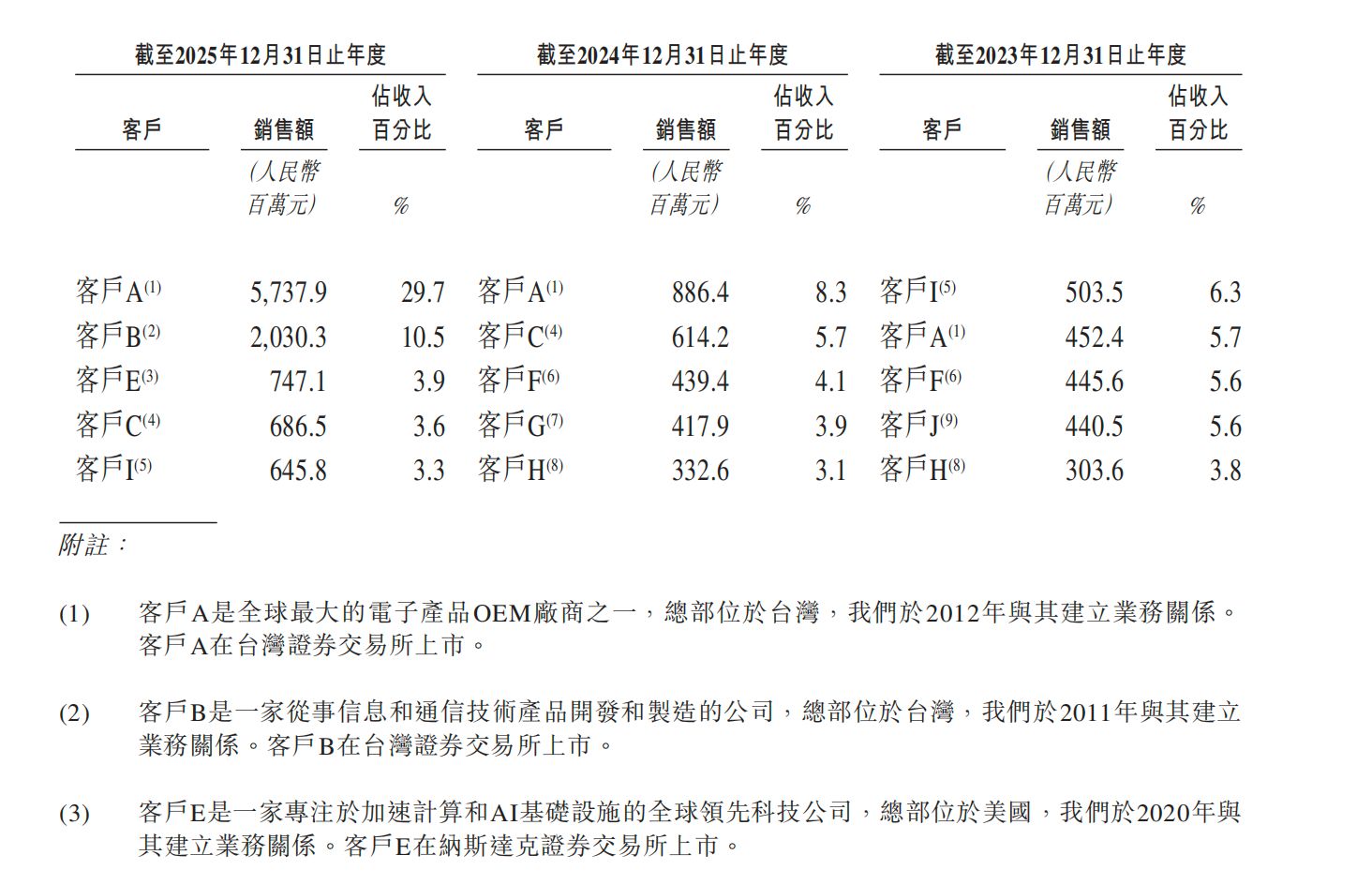 其中,2025年,公司对“客户E”的销售额为7.41亿元,占总收入的比例为3.9%。根据招股书对客户的描述:“公司E为一家专注于加速计算和AI基础设施的全球领先科技公司,总部位于美国,我们于2020年与其建立业务关系。客户E在纳斯达克证券交易所上市。”外界由此推断,公司E似乎符合英伟达的身份。