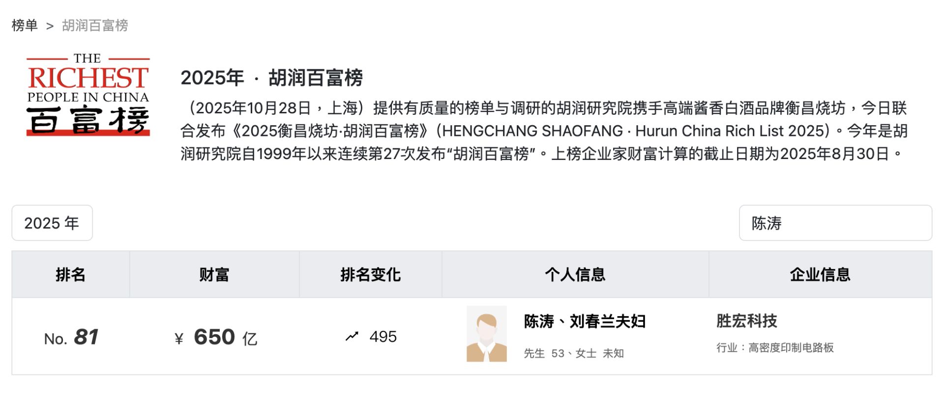 在《2025年胡润百富榜》上,陈涛、刘春兰夫妇身家达到了650亿元,距上一年暴涨了560亿元。陈涛、刘春兰夫妇也由此成为了广东省惠州市的首富,在榜单排名第81位。